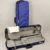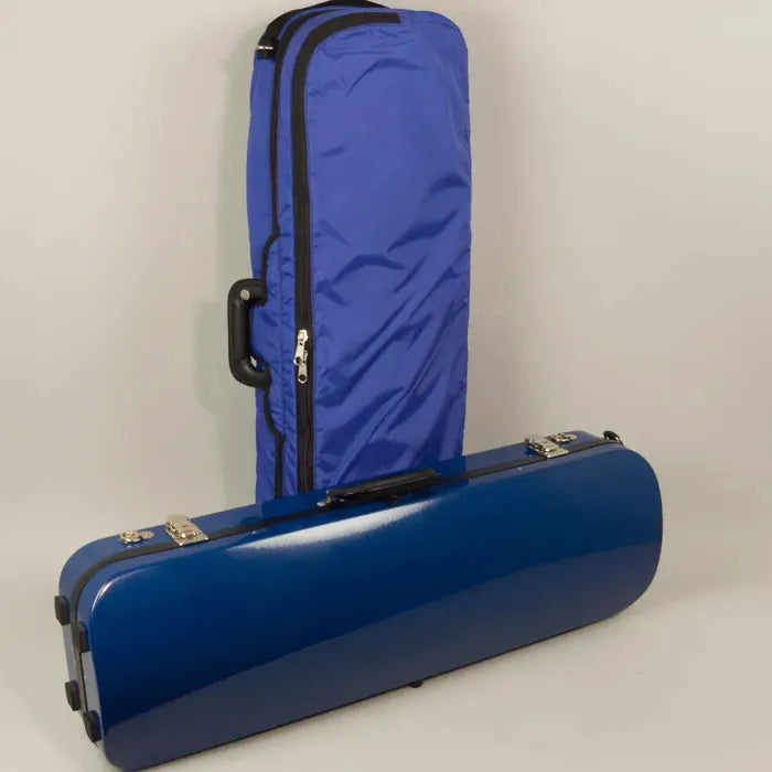 This blue exterior case has a silvery braided-carbon-fiber looking top, making it look very sharp and very modern, great for housing a unique electric violin! The interior is smokey-red velvet that shifts in color from gray to red under different light. These fiberglass cases are among the most popular Bobelock has ever carried. The bright colors allow the player to pick a case that expresses their personality as well as protecting their investment in a great violin. For players of solid-body electrics, it also means you can color-coordinate your case to either match or contrast with the wild colors of your electric violin. The famous Bobelock attention to detail is everywhere evident in this case; the fit and finish are excellent, the cover of the interior case pocket is constructed with piano hinges, and the case includes four bow holders, a hygrometer, and a humidifier. Each of their fiberglass cases also comes with a padded black nylon outer cover that zips over the case to protect the finish from scratches during transport.