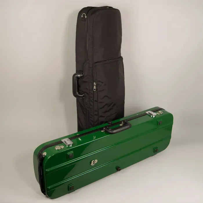 The oblong case from Bobelock offers plenty of storage inside the case for accessories, as well as having four bow holders, a hygrometer, and a humidifier. This case has a shiny green exterior and tan velour interior. Each of Bobelock’s fiberglass cases also comes with a padded black nylon outer cover that zips over the case to protect the finish from scratches during transport. These fiberglass cases are among the most popular Bobelock has ever carried. The color selection allows the player to pick a case that expresses their personality as well as protecting their investment in a great violin. For players of solid-body electrics, it also means you can color-coordinate your case to either match or contrast with the wild colors of your electric violin.