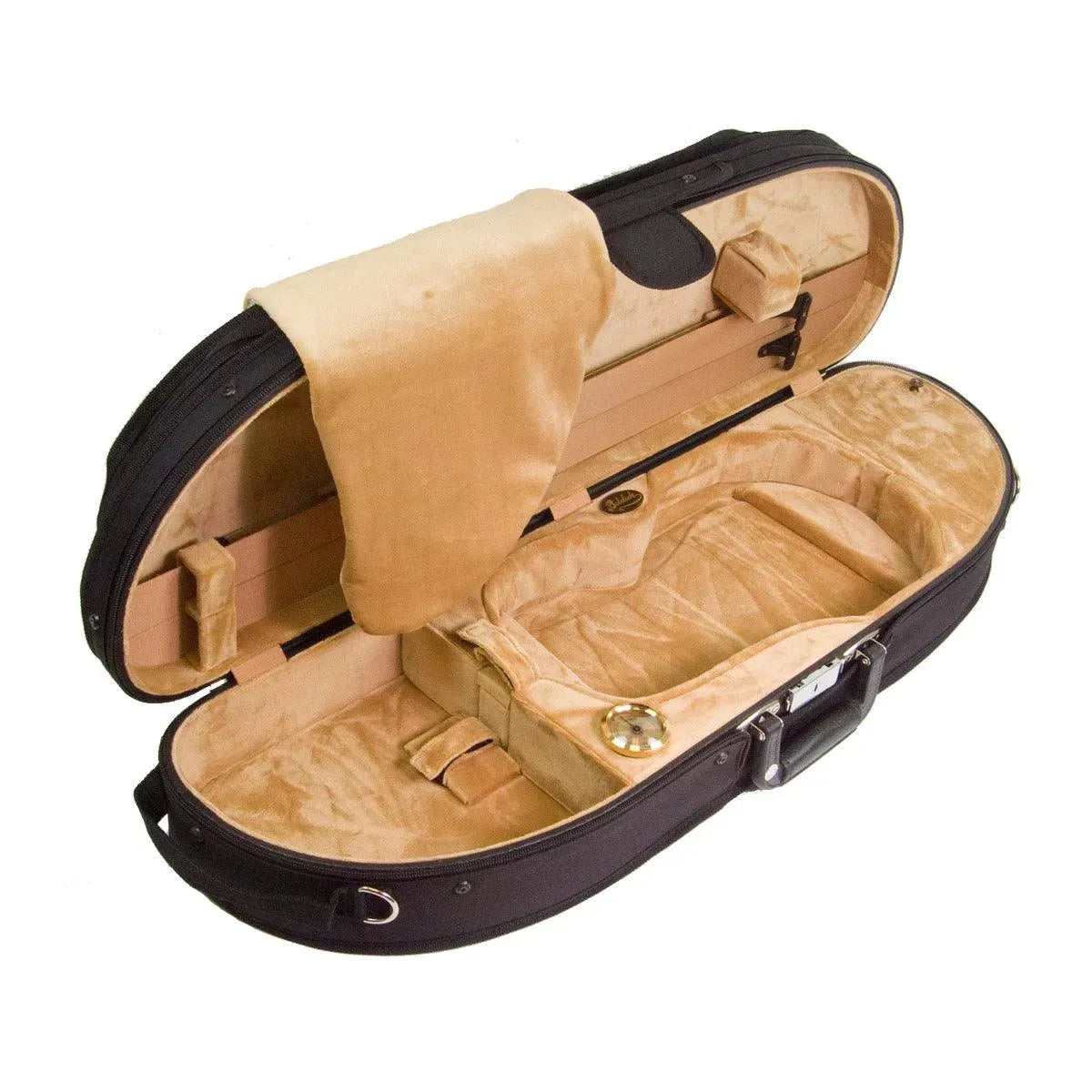 Bobelock’s famous attention to detail is everywhere evident in this case; the fit and finish are excellent, from the black canvas case cover to the tan velour interior, everything is carefully constructed with a quality that belies the reasonable price. A sturdy plywood shell, built-in hygrometer, neck strap to secure the instrument, and full suspension padding ensure that your violin will be well-protected. For convenience, a generous case pocket, outside music pocket, and two bow holders offer plenty of room for accessories.