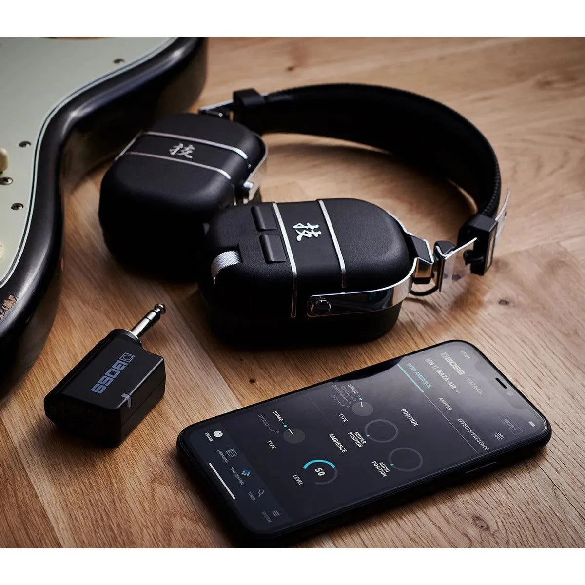 Over-ear guitar sound system with wireless connectivity, premium amp and effect tones, Bluetooth audio streaming, and sound editing via your smartphone