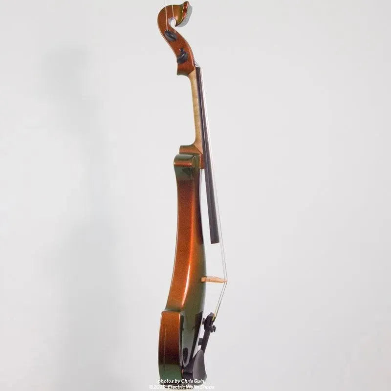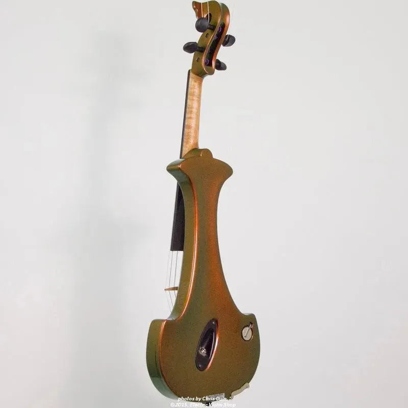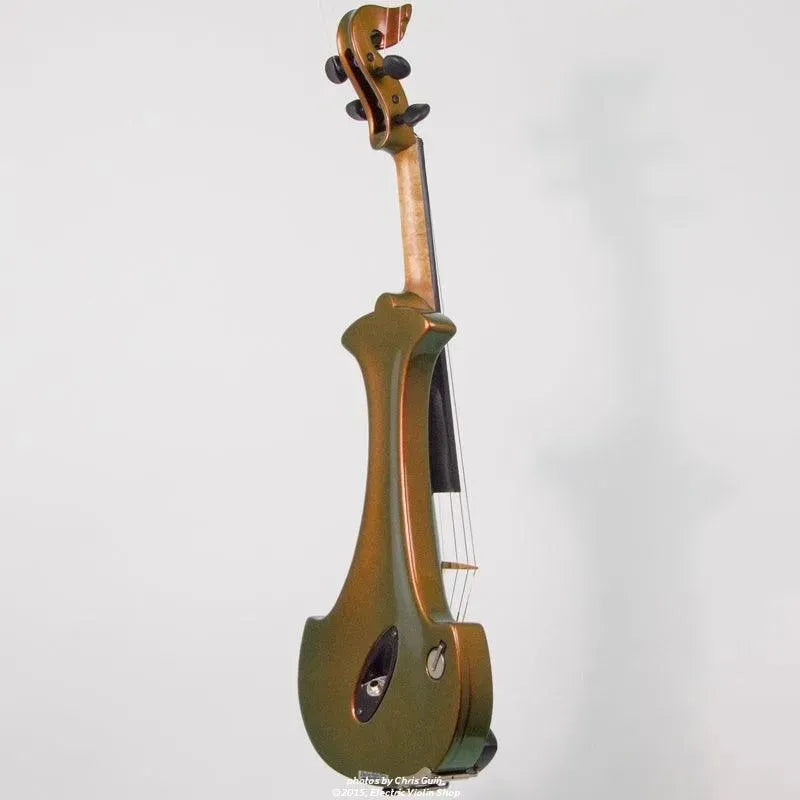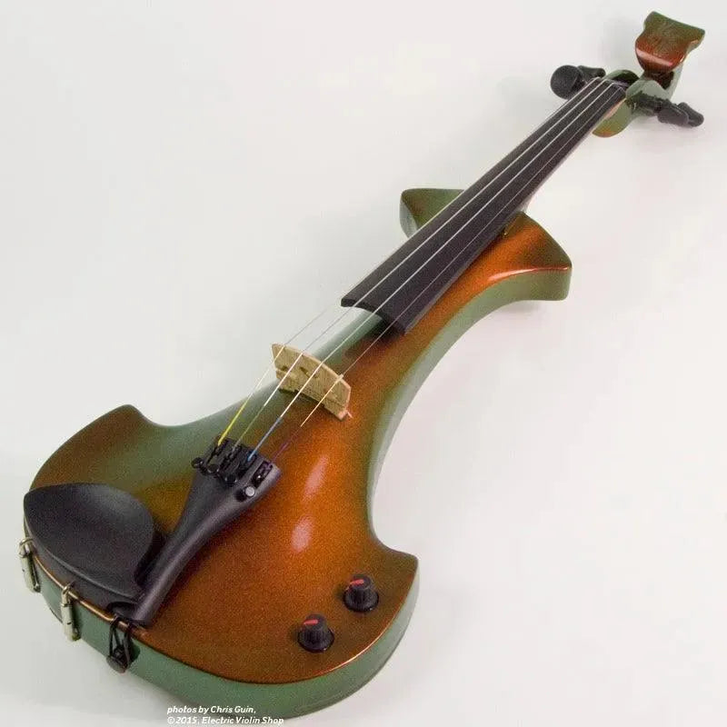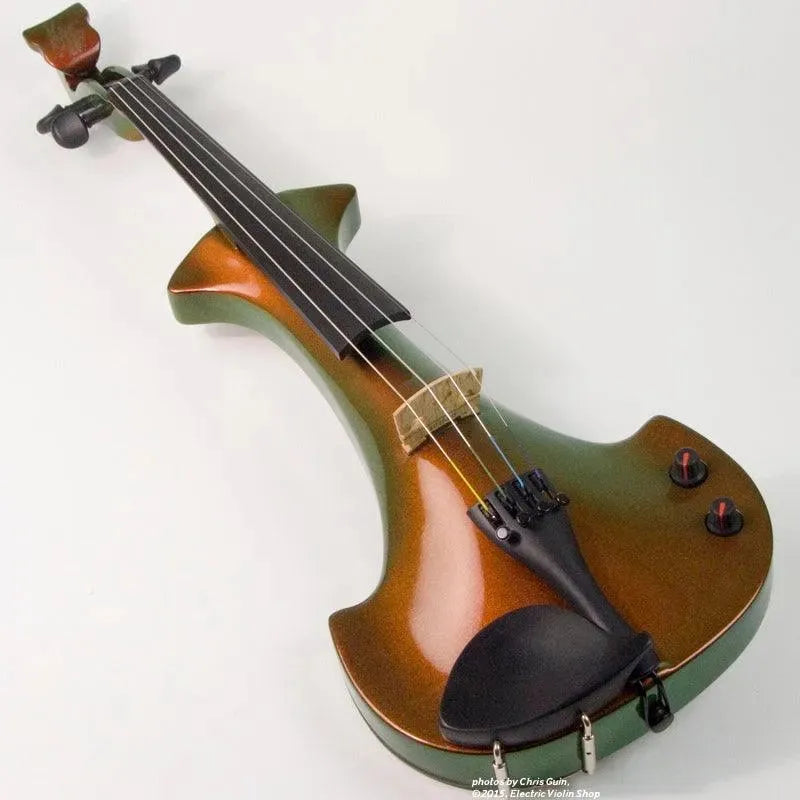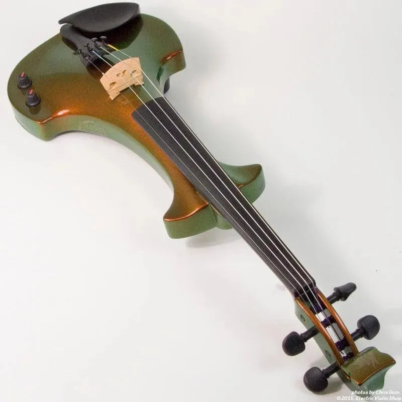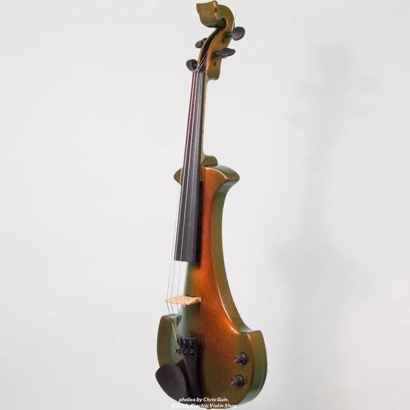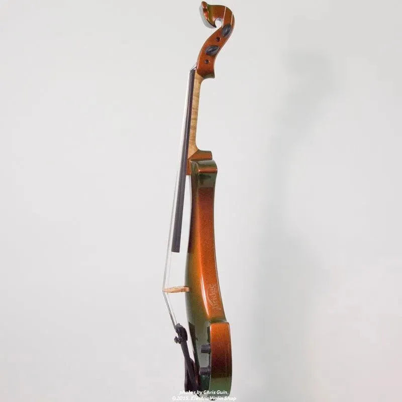 This “hi-spec” custom Illusion Bronze Aquila Dragon from Bridge Violins in the UK sports several upgrades from the standard model, built in the Far East. With upgraded electronics and Wittner Finetune pegs, this is the Aquila for players who are willing to make a bigger investment in an instrument of greater quality. First and foremost, it’s always about tone, and this is where the Aquila Dragon really shines. We already love the sound of the standard Bridge models, yet this Dragon model sounded noticeably better than the standard Bridge 5-string we tested it against. Immediate first impressions were of the instrument’s stronger output, but what really stood out and stayed with us was the beautiful balance of its tone. This Aquila has much more brilliance on the high strings, exhibiting a sparkle and clarity of tone with a notable absence of the harshness that sometimes plagues the violin’s upper register when it’s amplified. Now available in a variety of custom colors, this Dragon Aquila is finished in their beautiful Illusion Bronze paint. Look through all the photos — this finish exhibits color-changing abilities difficult to capture, that only an actual dragon’s scale could hope to match! (There is a fair amount of color variation with Illusion Bronze —- some instruments present primarily red/bronze to green/gold, while others have more of a green to gold shift, with very little red or bronze. The most recent example is shown here, but please view all photos to help you decide if this color is right for you.) Tuning is a breeze with the Wittner Finetune pegs, nearly making the fine tuners built into the Wittner composite tailpiece obsolete. The price of the Illusion Bronze Dragon Aquila includes the same custom hard shell case and carbon composite bow that comes with standard Bridge models.