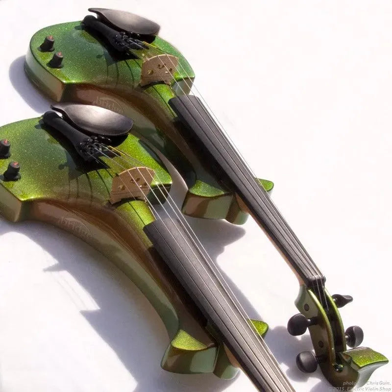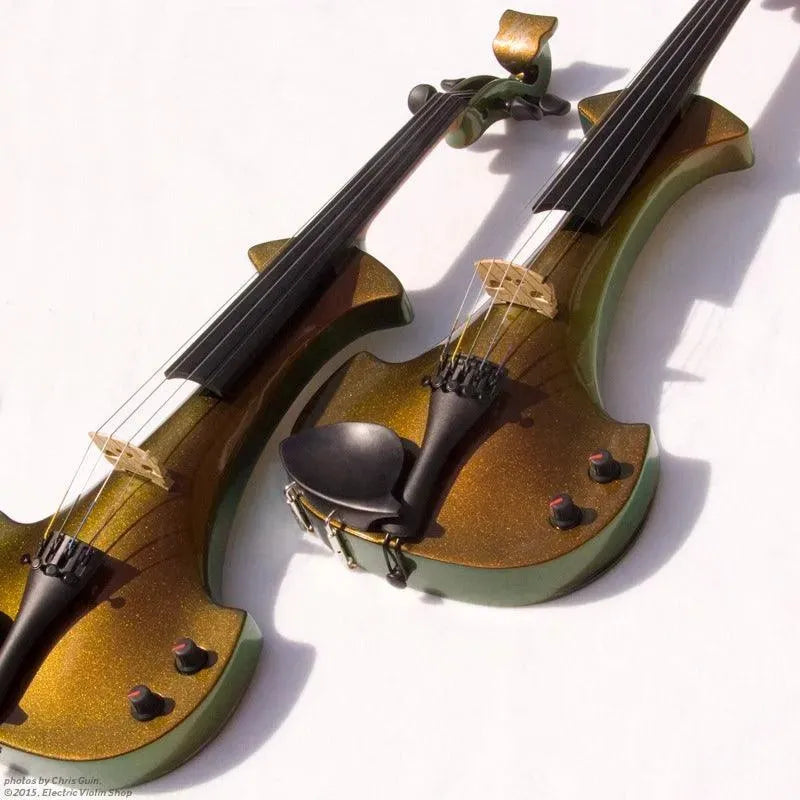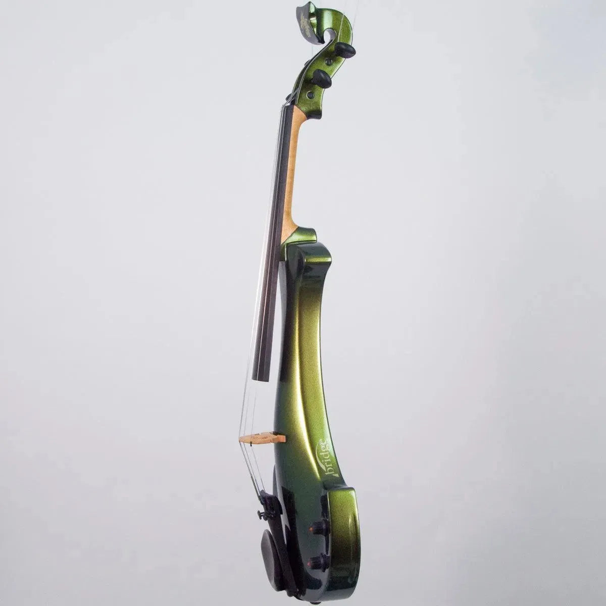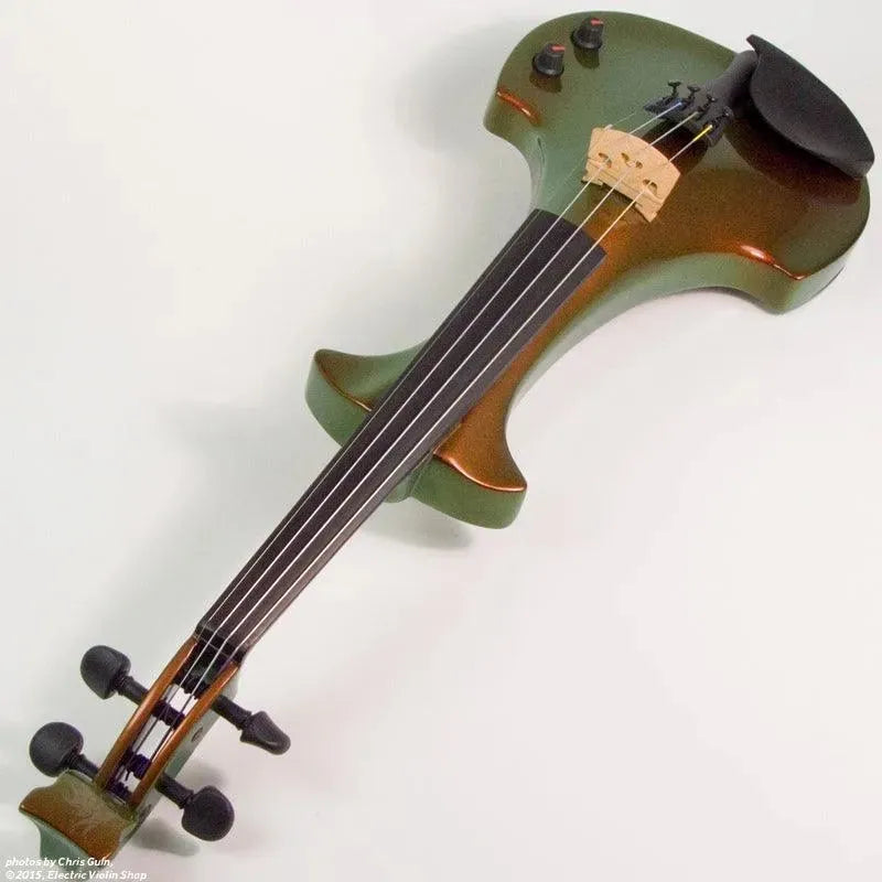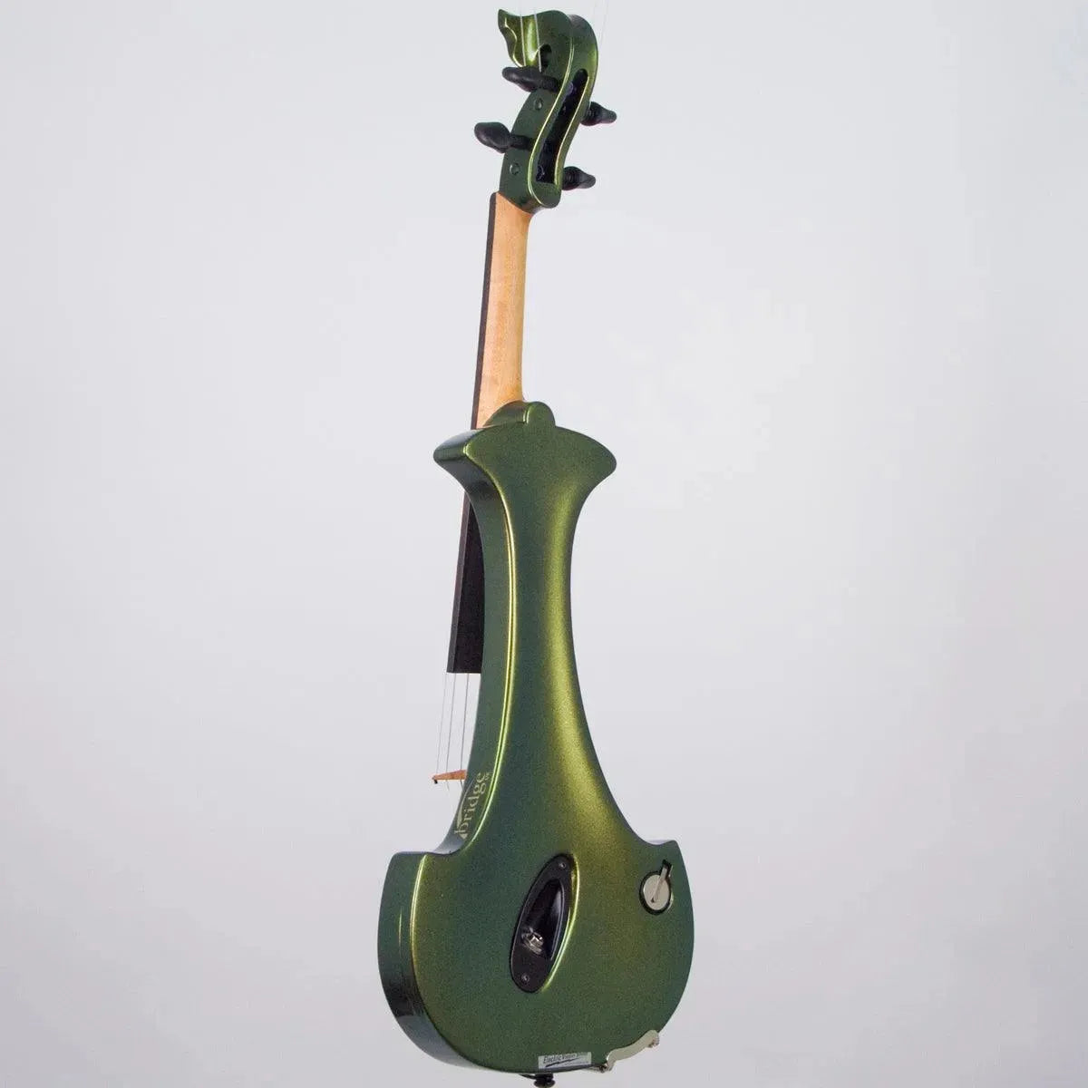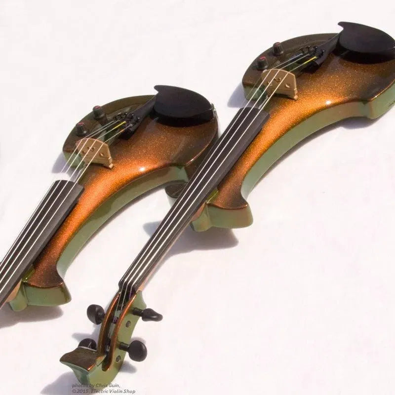This “hi-spec” custom Illusion Bronze Aquila Dragon from Bridge Violins in the UK sports several upgrades from the standard model, built in the Far East. With upgraded electronics and Wittner Finetune pegs, this is the Aquila for players who are willing to make a bigger investment in an instrument of greater quality. First and foremost, it’s always about tone, and this is where the Aquila Dragon really shines. We already love the sound of the standard Bridge models, yet this Dragon model sounded noticeably better than the standard Bridge 5-string we tested it against. Immediate first impressions were of the instrument’s stronger output, but what really stood out and stayed with us was the beautiful balance of its tone. This Aquila has much more brilliance on the high strings, exhibiting a sparkle and clarity of tone with a notable absence of the harshness that sometimes plagues the violin’s upper register when it’s amplified. Now available in a variety of custom colors, this Dragon Aquila is finished in their beautiful Illusion Bronze paint. Look through all the photos — this finish exhibits color-changing abilities difficult to capture, that only an actual dragon’s scale could hope to match! (There is a fair amount of color variation with Illusion Bronze —- some instruments present primarily red/bronze to green/gold, while others have more of a green to gold shift, with very little red or bronze. The most recent example is shown here, but please view all photos to help you decide if this color is right for you.) Tuning is a breeze with the Wittner Finetune pegs, nearly making the fine tuners built into the Wittner composite tailpiece obsolete. The price of the Illusion Bronze Dragon Aquila includes the same custom hard shell case and carbon composite bow that comes with standard Bridge models.