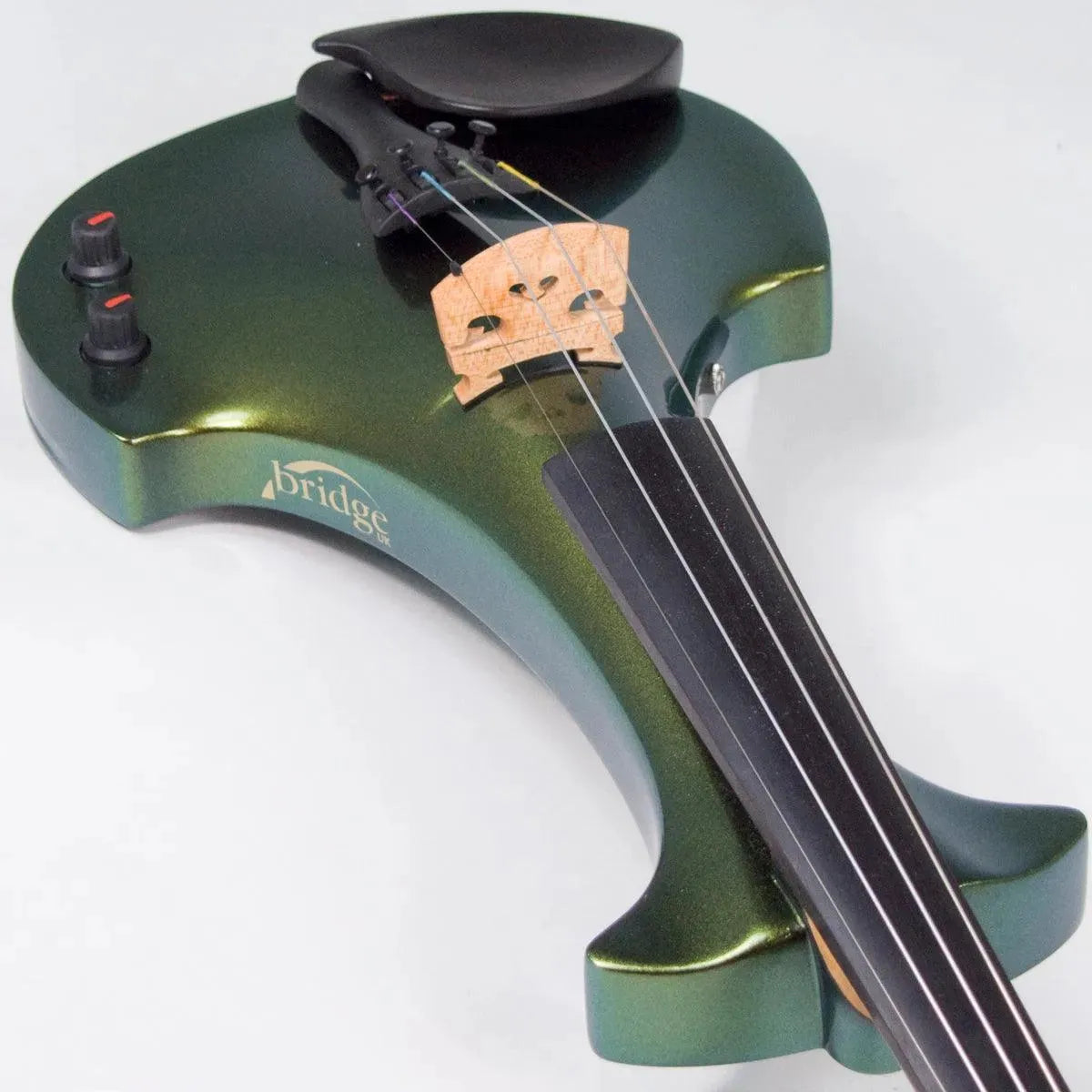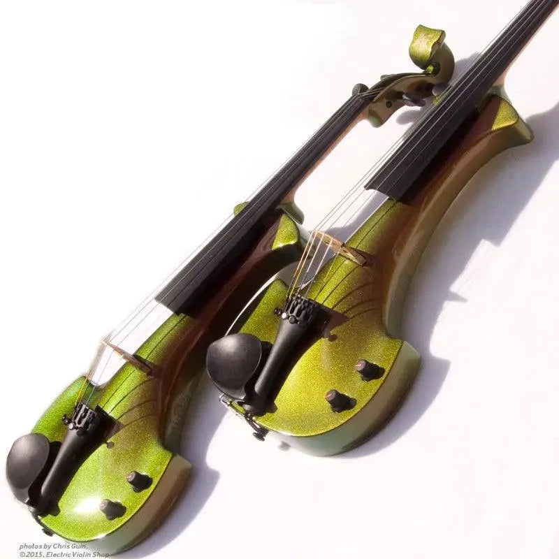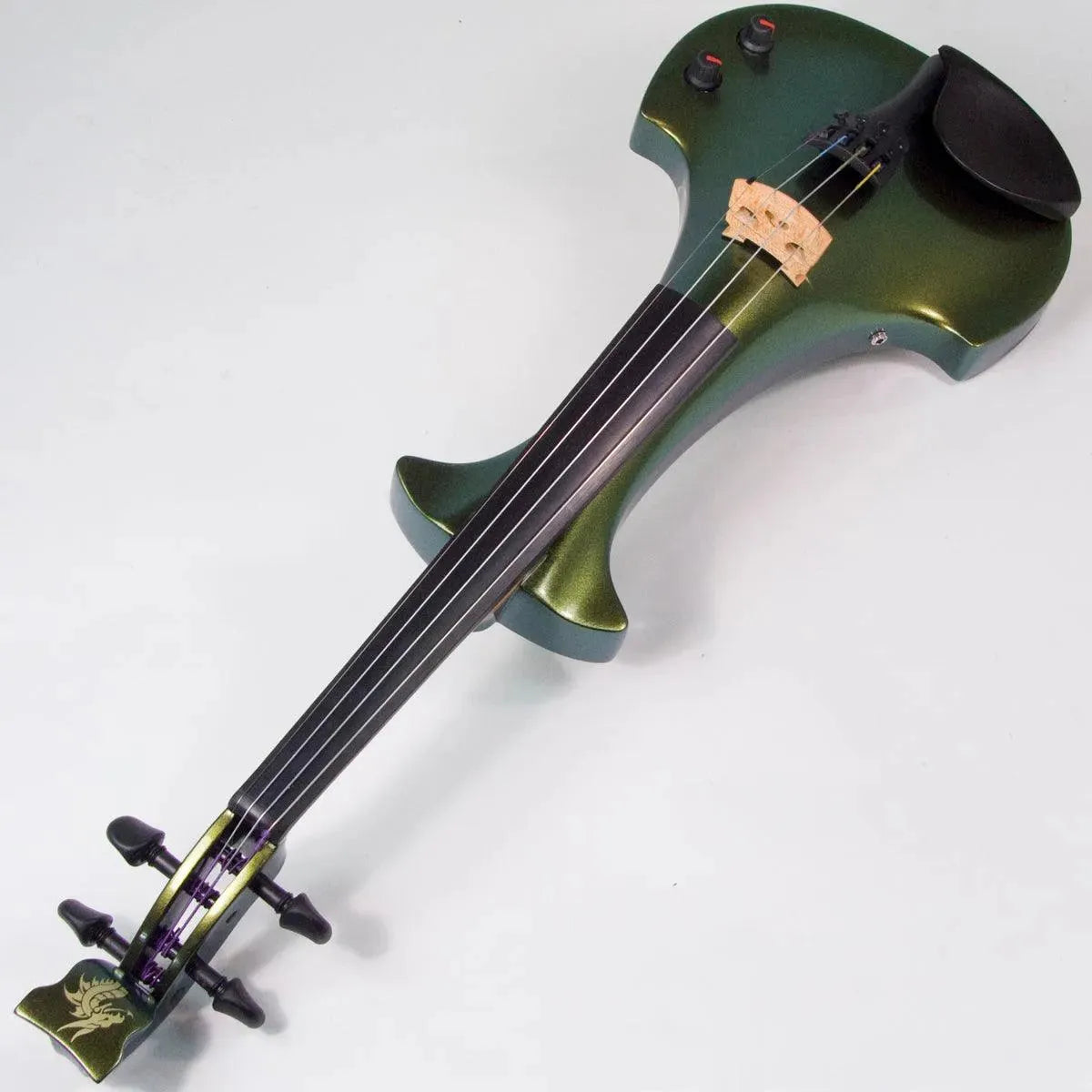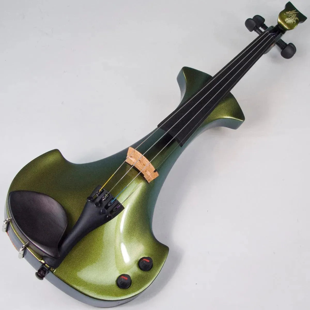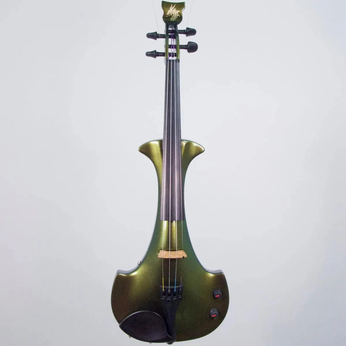 This “hi-spec” custom Illusion Bronze Aquila Dragon from Bridge Violins in the UK sports several upgrades from the standard model, built in the Far East. With upgraded electronics and Wittner Finetune pegs, this is the Aquila for players who are willing to make a bigger investment in an instrument of greater quality. First and foremost, it’s always about tone, and this is where the Aquila Dragon really shines. We already love the sound of the standard Bridge models, yet this Dragon model sounded noticeably better than the standard Bridge 5-string we tested it against. Immediate first impressions were of the instrument’s stronger output, but what really stood out and stayed with us was the beautiful balance of its tone. This Aquila has much more brilliance on the high strings, exhibiting a sparkle and clarity of tone with a notable absence of the harshness that sometimes plagues the violin’s upper register when it’s amplified. Now available in a variety of custom colors, this Dragon Aquila is finished in their beautiful Illusion Bronze paint. Look through all the photos — this finish exhibits color-changing abilities difficult to capture, that only an actual dragon’s scale could hope to match! (There is a fair amount of color variation with Illusion Bronze —- some instruments present primarily red/bronze to green/gold, while others have more of a green to gold shift, with very little red or bronze. The most recent example is shown here, but please view all photos to help you decide if this color is right for you.) Tuning is a breeze with the Wittner Finetune pegs, nearly making the fine tuners built into the Wittner composite tailpiece obsolete. The price of the Illusion Bronze Dragon Aquila includes the same custom hard shell case and carbon composite bow that comes with standard Bridge models.