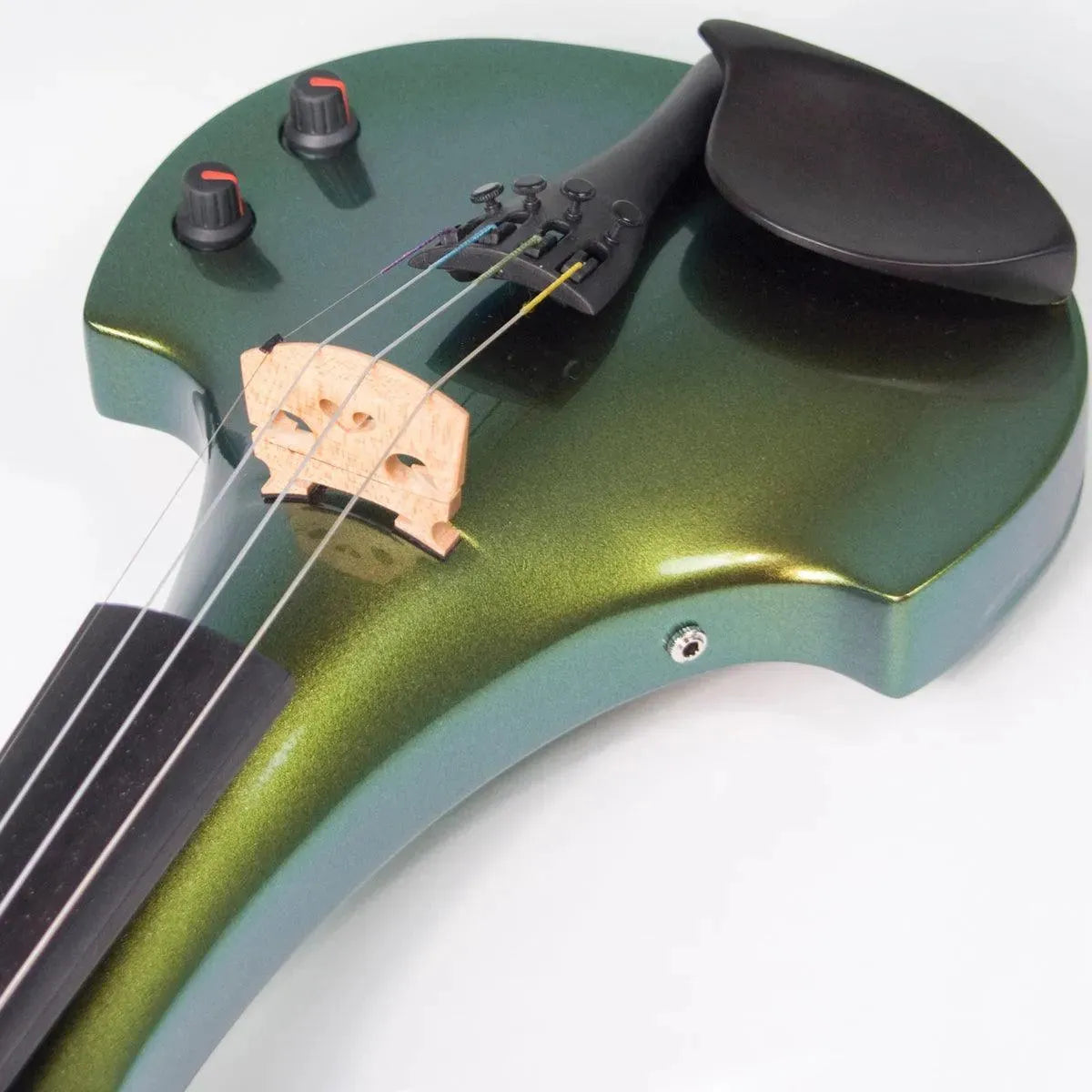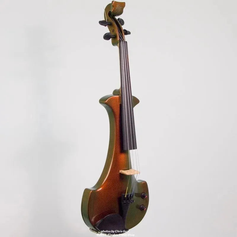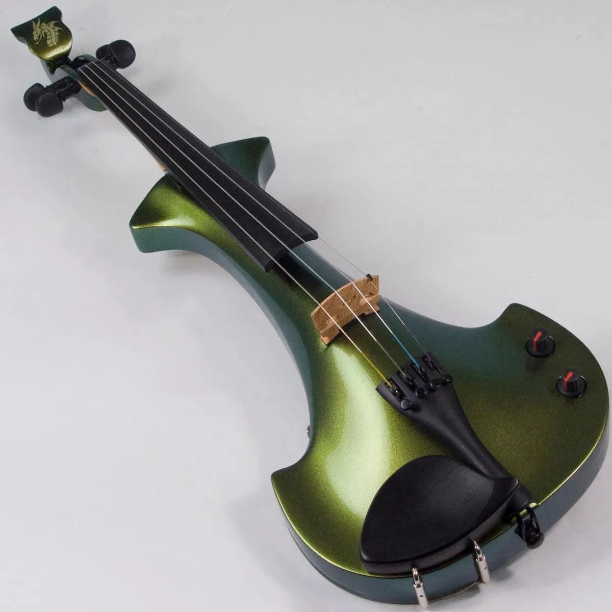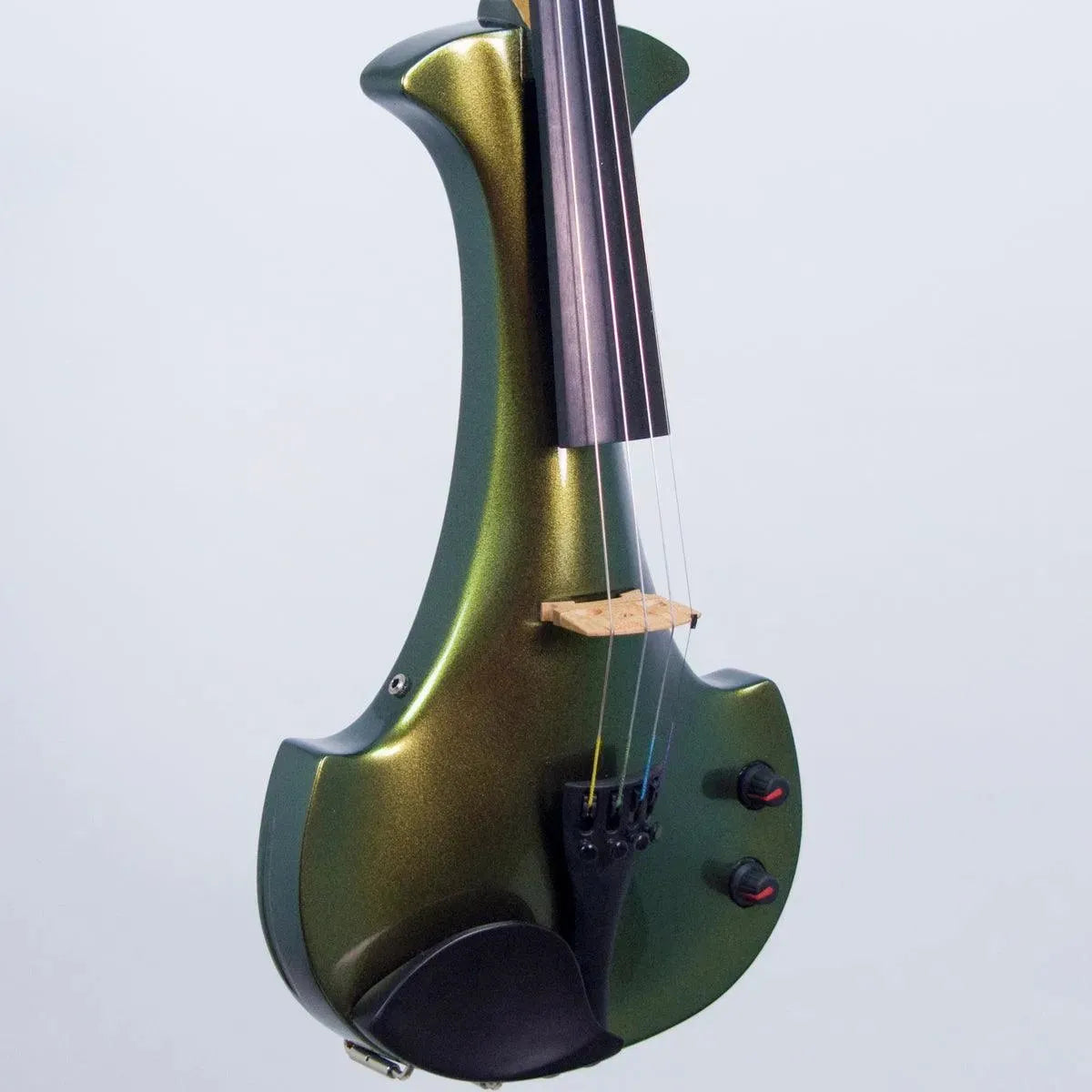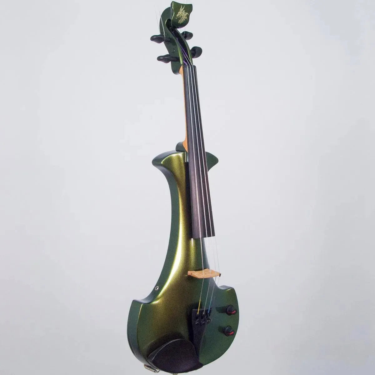 This “hi-spec” custom Illusion Bronze Aquila Dragon from Bridge Violins in the UK sports several upgrades from the standard model, built in the Far East. With upgraded electronics and Wittner Finetune pegs, this is the Aquila for players who are willing to make a bigger investment in an instrument of greater quality. First and foremost, it’s always about tone, and this is where the Aquila Dragon really shines. We already love the sound of the standard Bridge models, yet this Dragon model sounded noticeably better than the standard Bridge 5-string we tested it against. Immediate first impressions were of the instrument’s stronger output, but what really stood out and stayed with us was the beautiful balance of its tone. This Aquila has much more brilliance on the high strings, exhibiting a sparkle and clarity of tone with a notable absence of the harshness that sometimes plagues the violin’s upper register when it’s amplified. Now available in a variety of custom colors, this Dragon Aquila is finished in their beautiful Illusion Bronze paint. Look through all the photos — this finish exhibits color-changing abilities difficult to capture, that only an actual dragon’s scale could hope to match! (There is a fair amount of color variation with Illusion Bronze —- some instruments present primarily red/bronze to green/gold, while others have more of a green to gold shift, with very little red or bronze. The most recent example is shown here, but please view all photos to help you decide if this color is right for you.) Tuning is a breeze with the Wittner Finetune pegs, nearly making the fine tuners built into the Wittner composite tailpiece obsolete. The price of the Illusion Bronze Dragon Aquila includes the same custom hard shell case and carbon composite bow that comes with standard Bridge models.