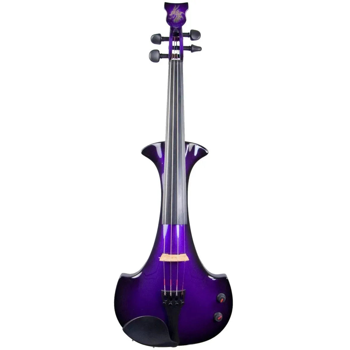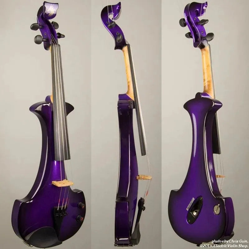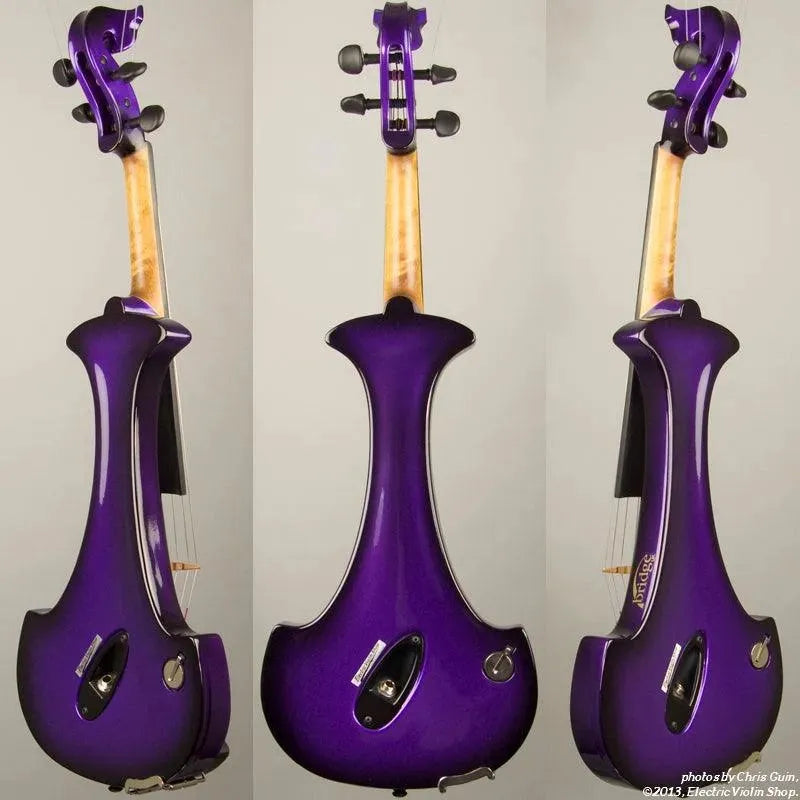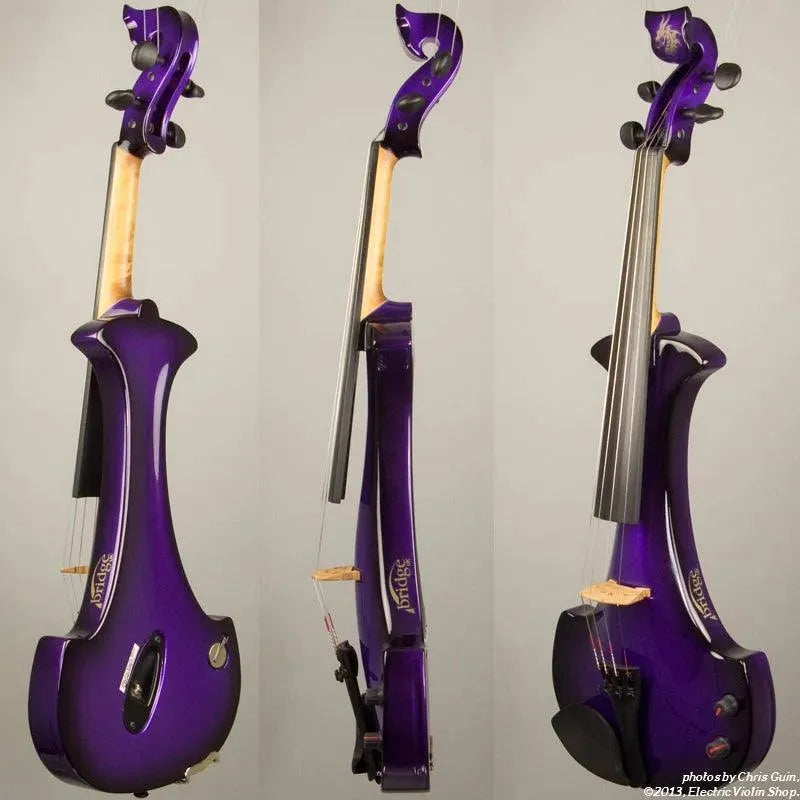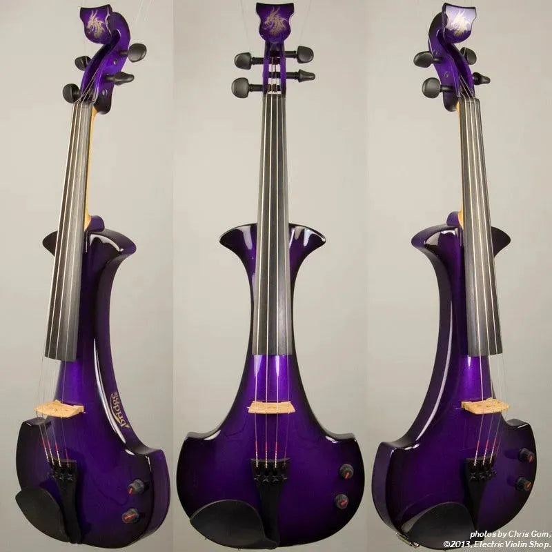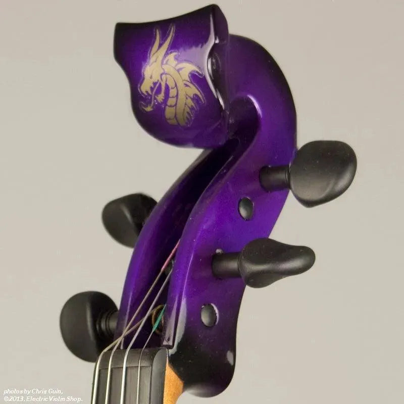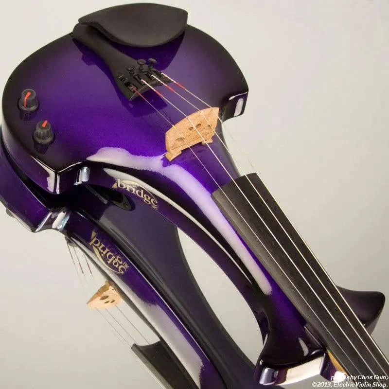 New from Bridge UK, this Purple Dragon Aquila is their custom “hi-spec” model, equipped with Wittner Finetune geared pegs and upgraded electronics that use two coin-cell batteries. We found the instrument’s tone better balanced across the instrument’s range than the standard Aquila, with a noticeably stronger output and more brilliance on the high strings, without treble harshness. The Purple Dragons were originally available only in this gorgeous metallic purple to black fade.This “hi-spec” custom Purple Dragon Aquila from Bridge Violins in the UK sports several upgrades from the standard model, built in the Far East. With upgraded electronics and Wittner Finetune pegs, this is the Aquila for players who are willing to make a bigger investment in an instrument of greater quality. First and foremost, it’s always about tone, and this is where the Purple Dragon really shines. We already love the sound of the standard Bridge models, yet this Aquila sounded noticeably better than the standard Bridge 4-string we tested it against. Immediate first impressions were of the instrument’s stronger output, but what really stood out and stayed with us was the beautiful balance of its tone. This Aquila has much more brilliance on the high strings, exhibiting a sparkle and clarity of tone with a notable absence of the harshness that sometimes plagues the violin’s upper register when it’s amplified. Originally only available one finish, this Purple Dragon is a gorgeous metallic purple fading to black at the edges. This is a true purple, rich and saturated, closer in appearance to the purple metallic that was so popular that it was almost a company trademark for Bridge five years ago. Tuning is a breeze with the Wittner Finetune pegs, nearly making the fine tuners built into the Wittner composite tailpiece obsolete. The price of the Purple Dragon includes the same custom hard shell case and carbon composite bow that comes with standard Bridge models.