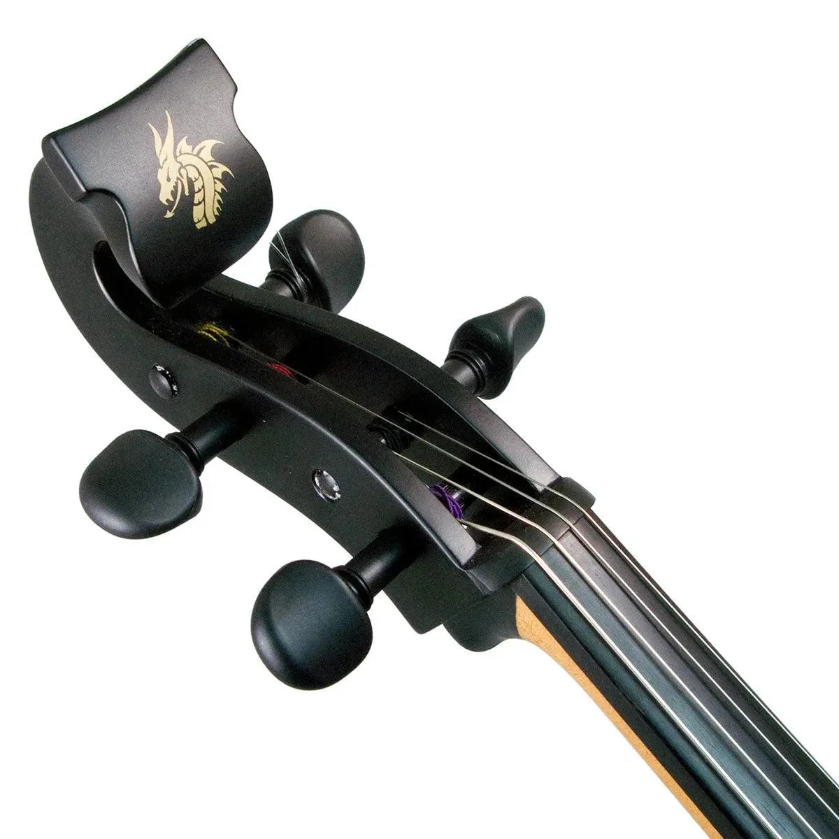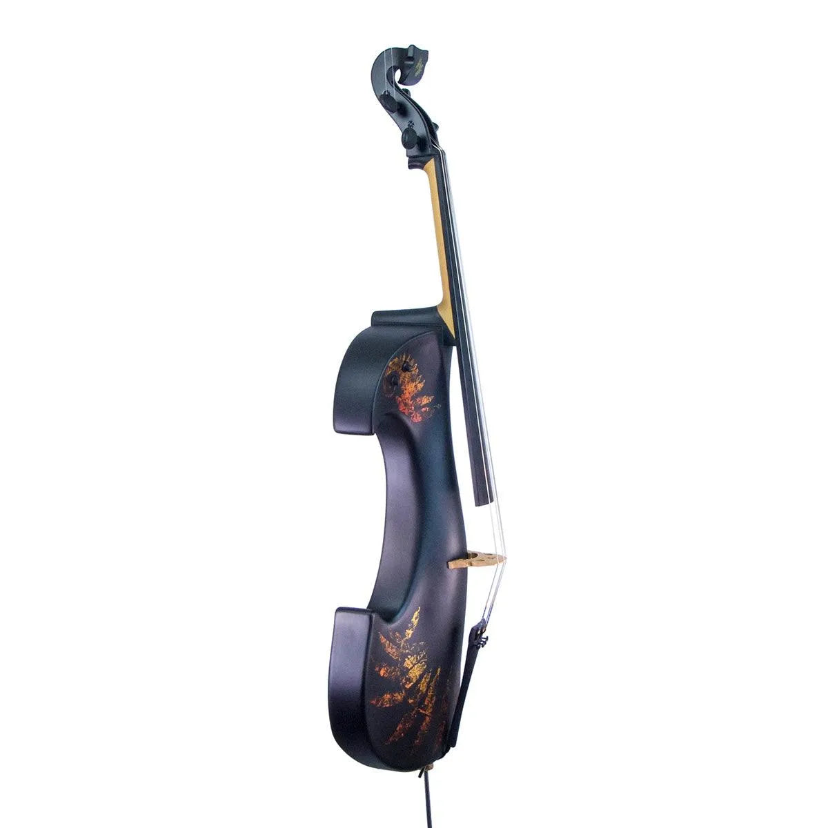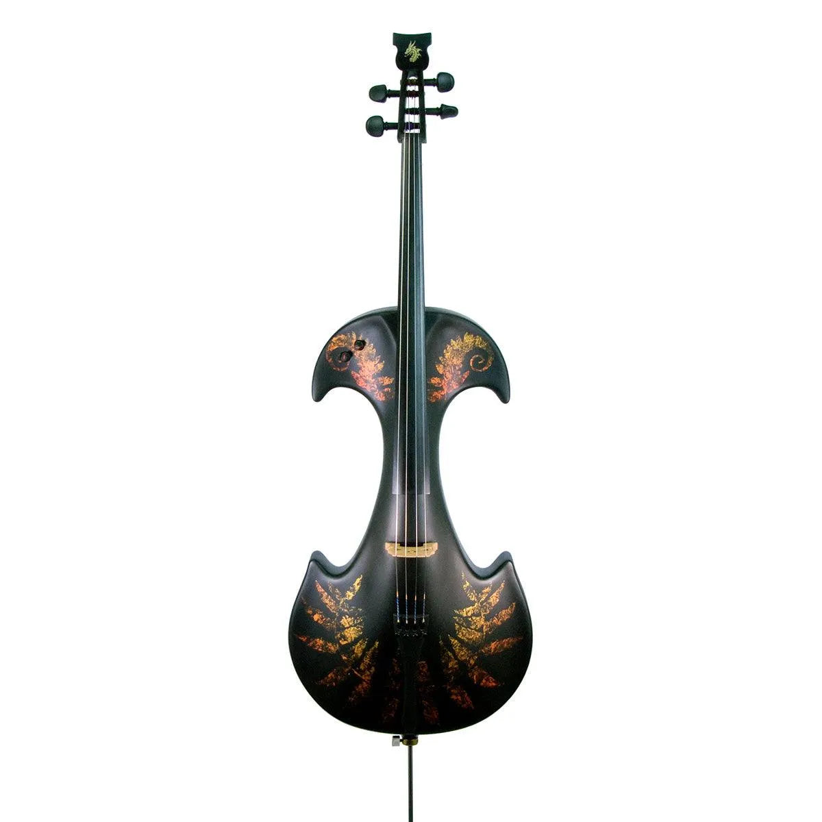 The Draco cello is made of a carbon fiber/Kevlar? composite, with a semi hollow-body design that preserves all the physical reference points of an acoustic cello. Curvy and sexy, this is cello sounds as amazing as it looks. This model is a Dragon, which is an upgraded version with superior electronics to the standard Draco model, as well as auxiliary mini jack headphone output and Wittner finetune geared ebony-lookalike pegs. The unique Phoenix wings-of-fire design is over a matte black finish, which affords this high end cello a particularly luxurious look.