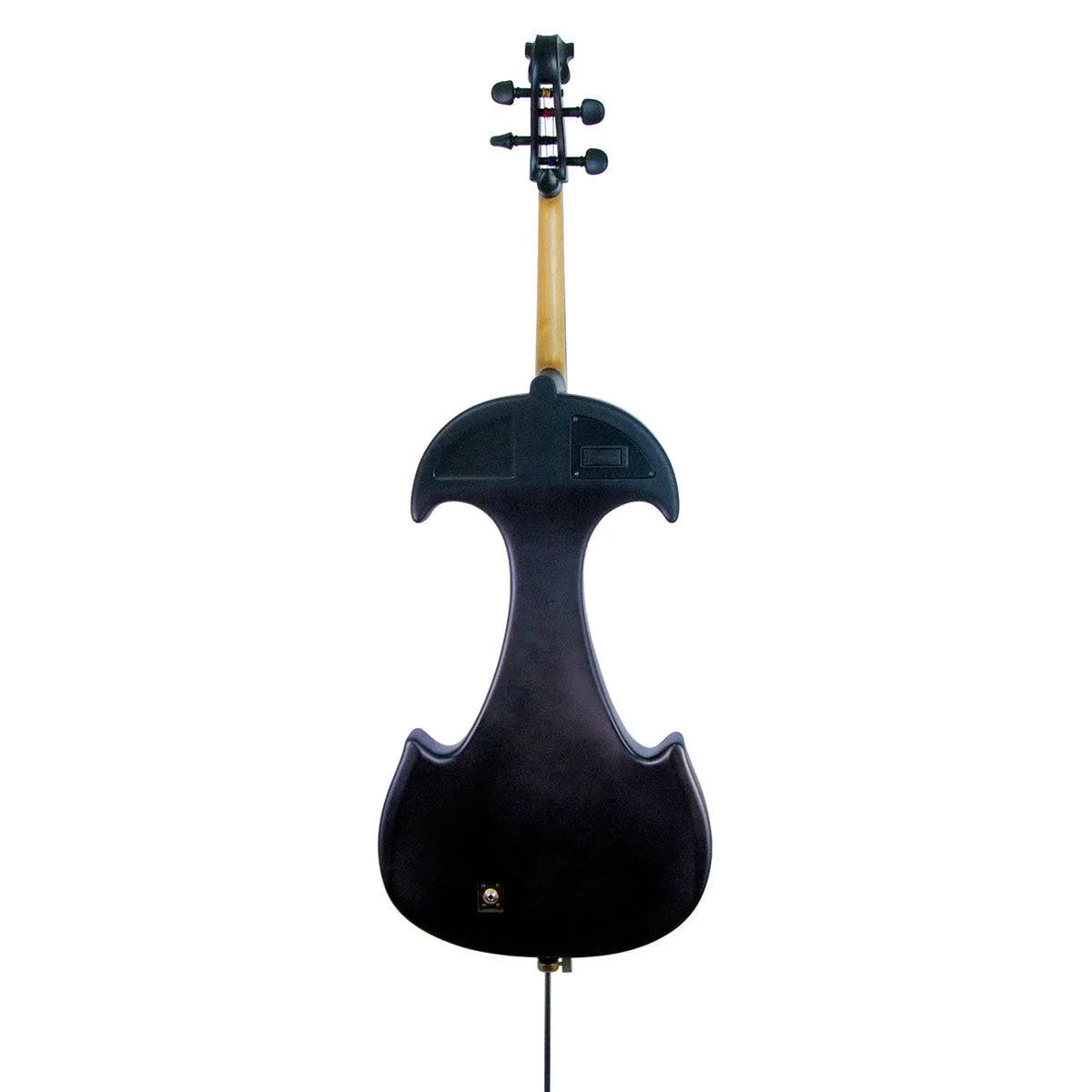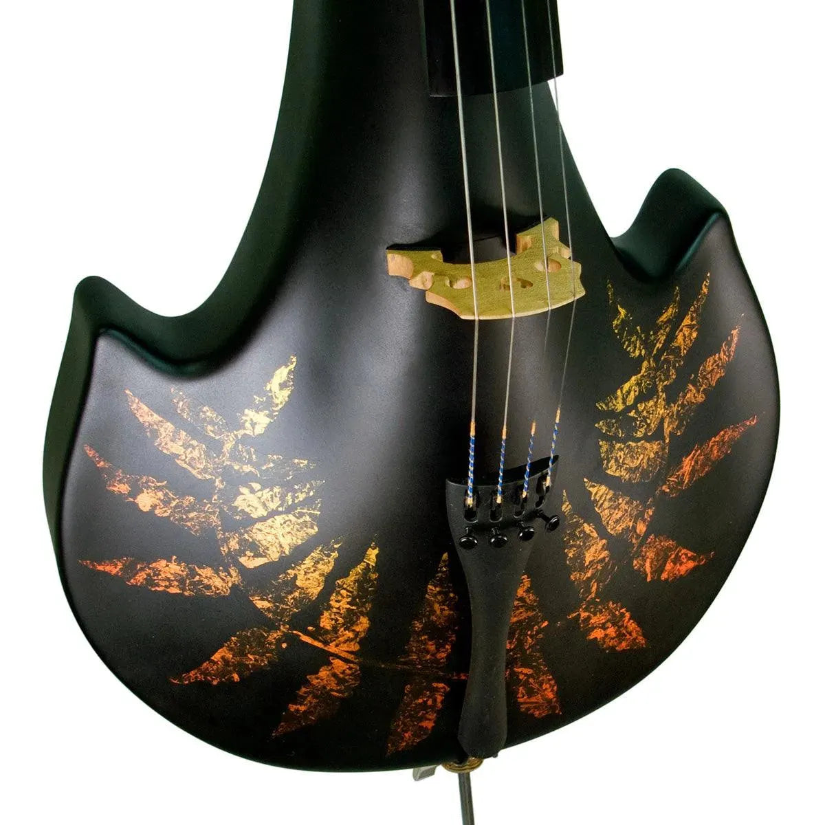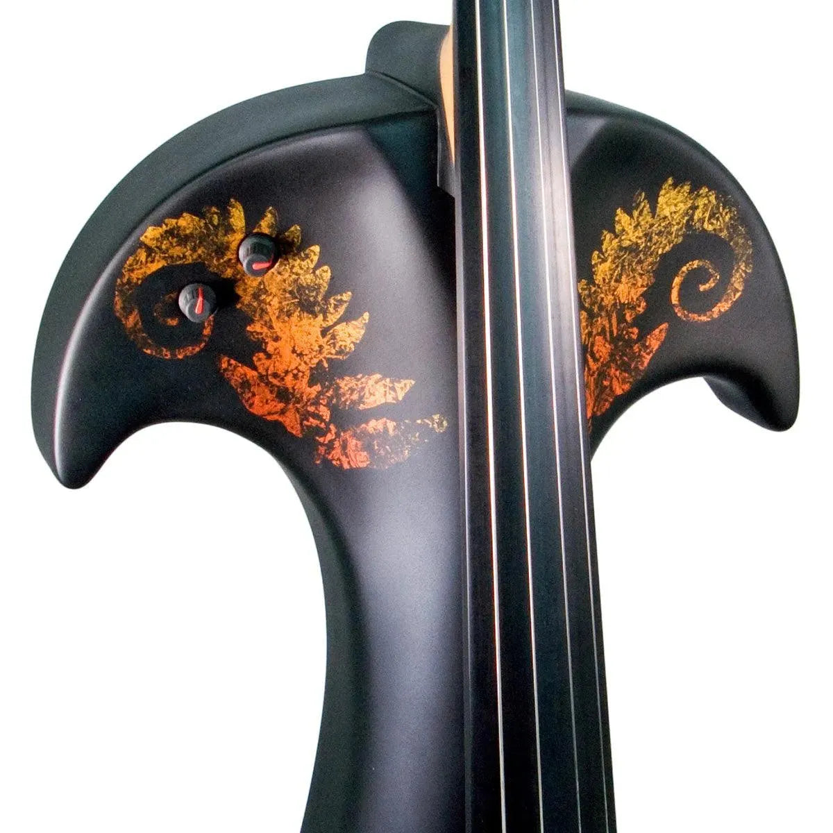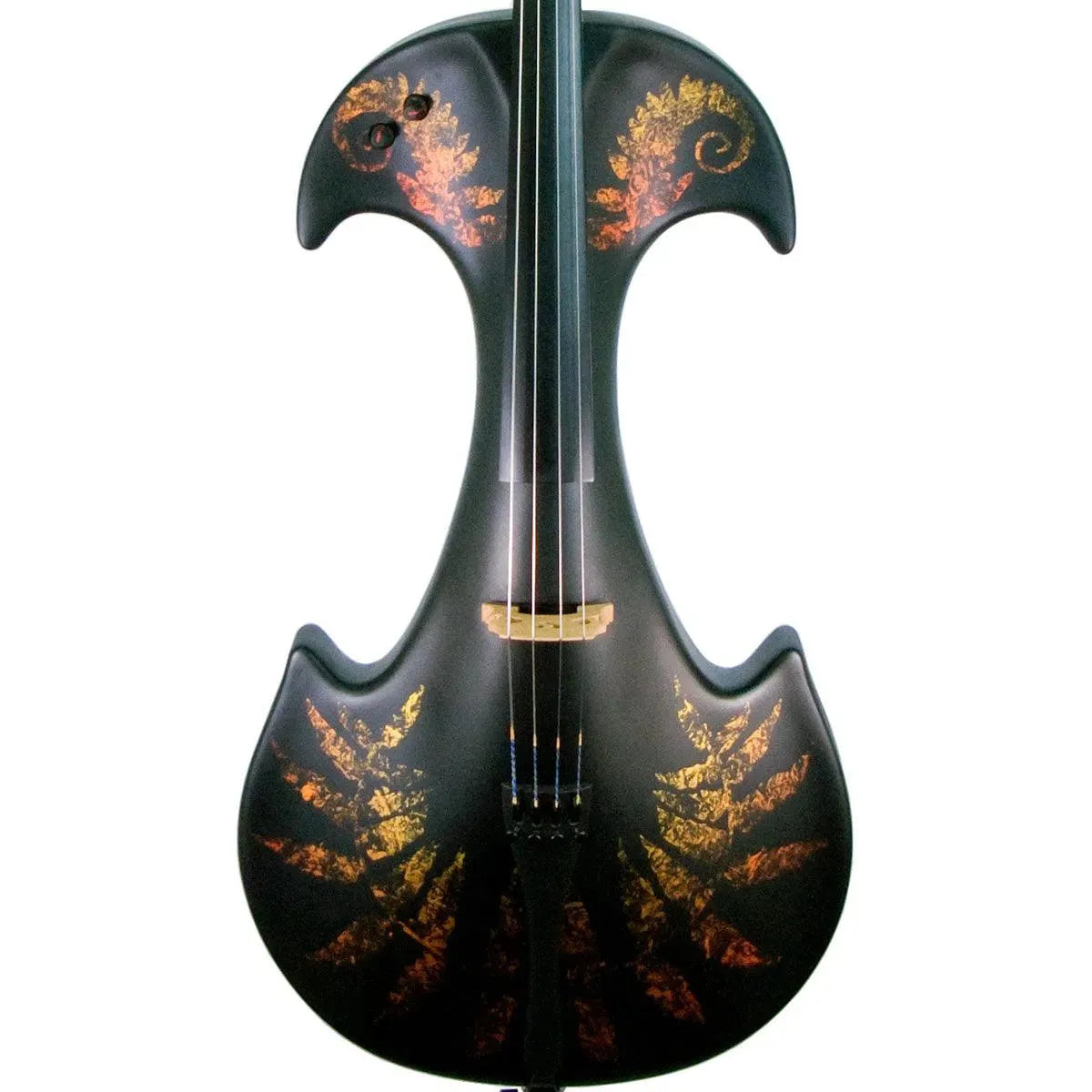 The Draco cello is made of a carbon fiber/Kevlar? composite, with a semi hollow-body design that preserves all the physical reference points of an acoustic cello. Curvy and sexy, this is cello sounds as amazing as it looks. This model is a Dragon, which is an upgraded version with superior electronics to the standard Draco model, as well as auxiliary mini jack headphone output and Wittner finetune geared ebony-lookalike pegs. The unique Phoenix wings-of-fire design is over a matte black finish, which affords this high end cello a particularly luxurious look.