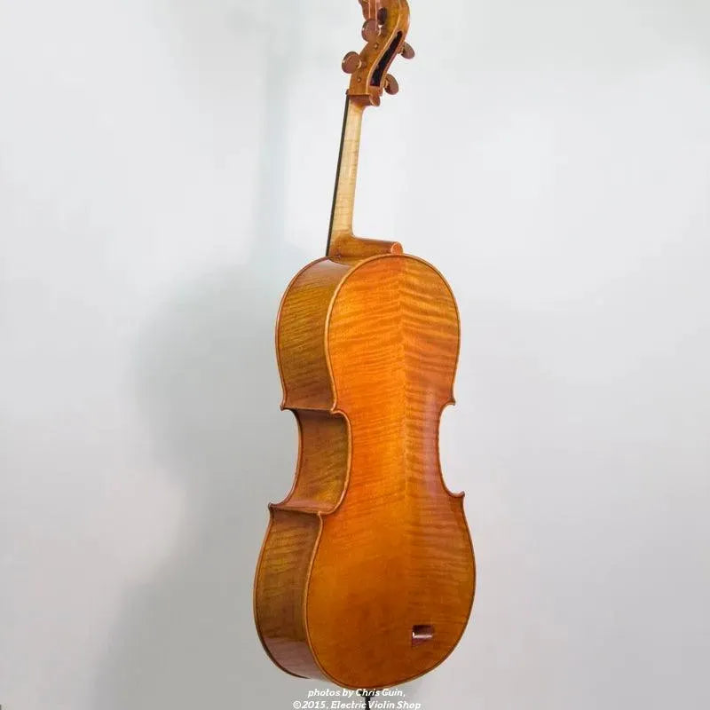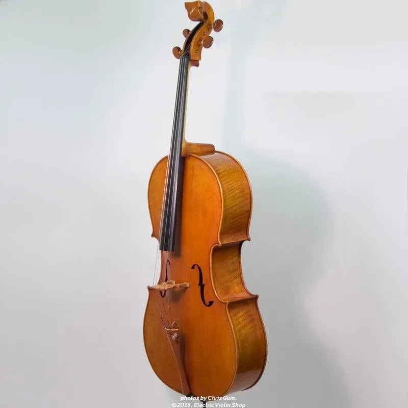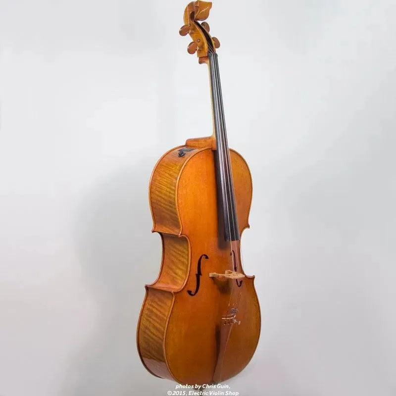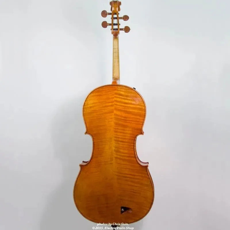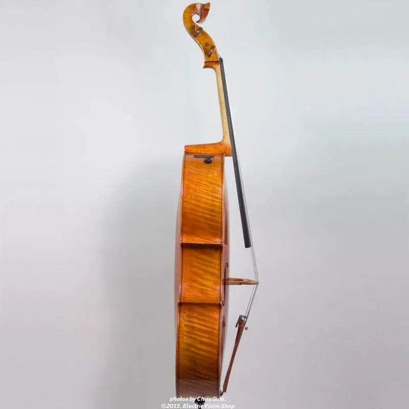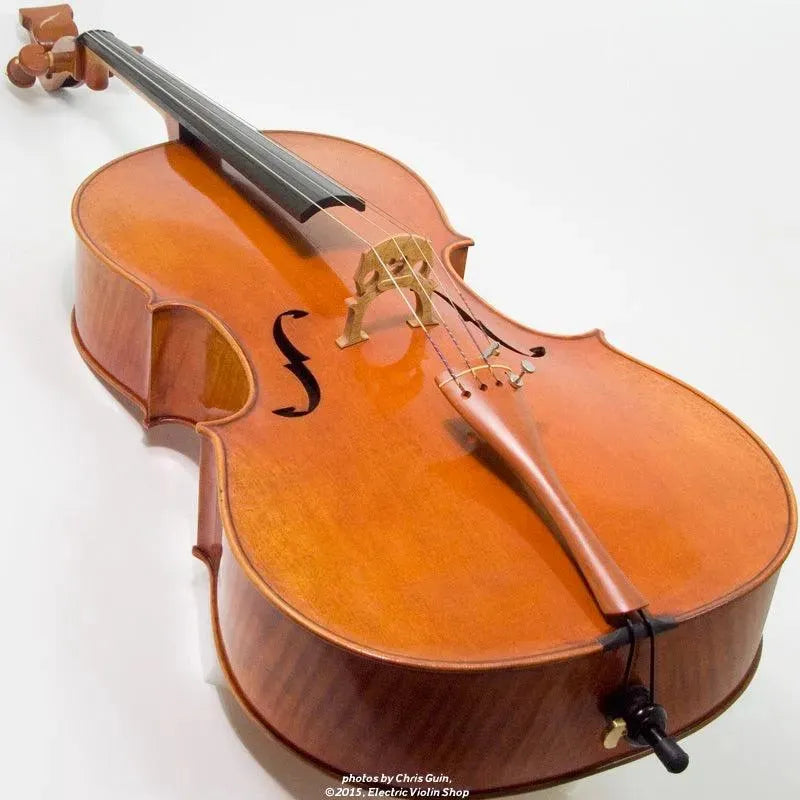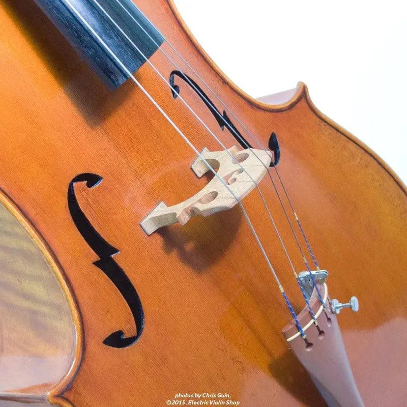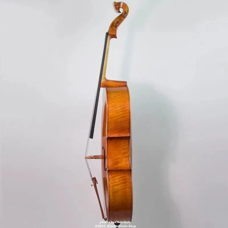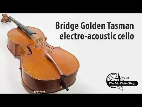 The Bridge Golden Tasman is a high-spec electro-acoustic cello for the discerning player. The Golden Tasman has a warm, rich acoustic sound, with the color and complexity of a good acoustic cello. Plugged in, the amplified tone is even more impressive — we are amazed at just how good this cello sounds! The tightly-grained spruce top and figured maple back are finished in a heavily-antiqued golden oil varnish. A custom hardshell case is included.