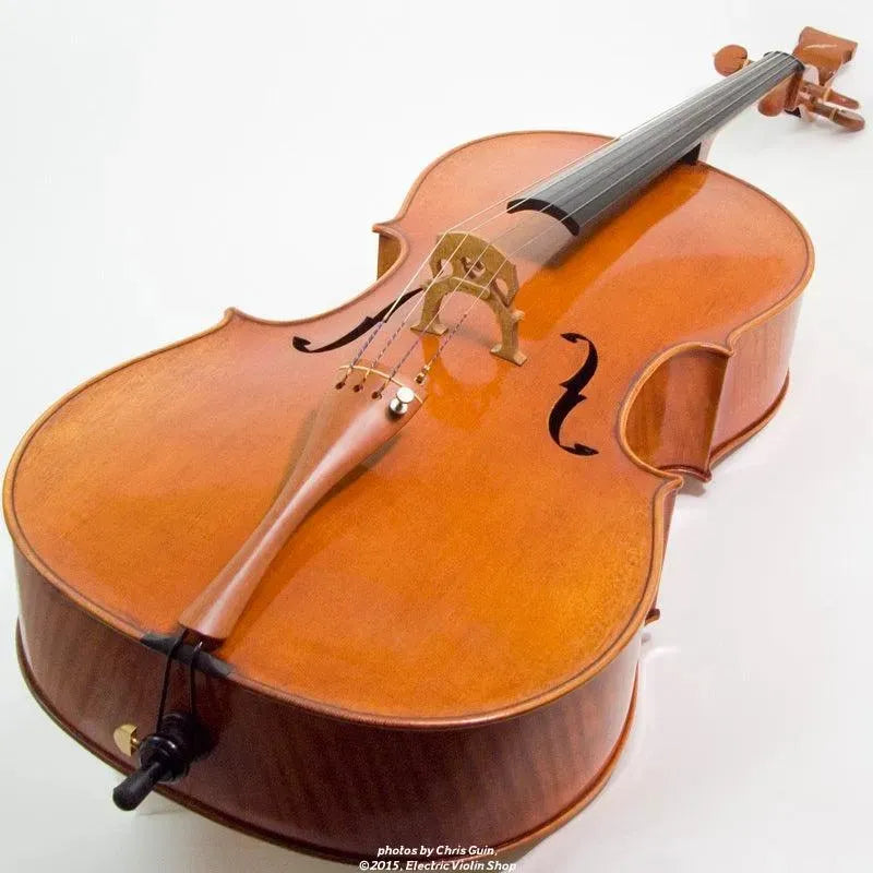 The cello’s built-in preamp is powered by a single 9-volt battery. A custom hardshell case is included with all Golden Tasman cellos.