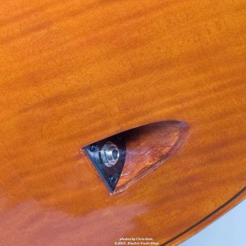 The biggest departure, and one that’s less appealing aesthetically, but conceptually brilliant, is the placement of the Golden Tasman’s output jack. Recessed into the arch of the cello’s back, at first glance it appears jarring, even a bit awkward. Functionally, it directs the output cable away from the player, allowing for a more discreet appearance — from the front, you’d hardly notice the cello was amplified at all, unless you noticed the tone knob on the bass side upper bout.