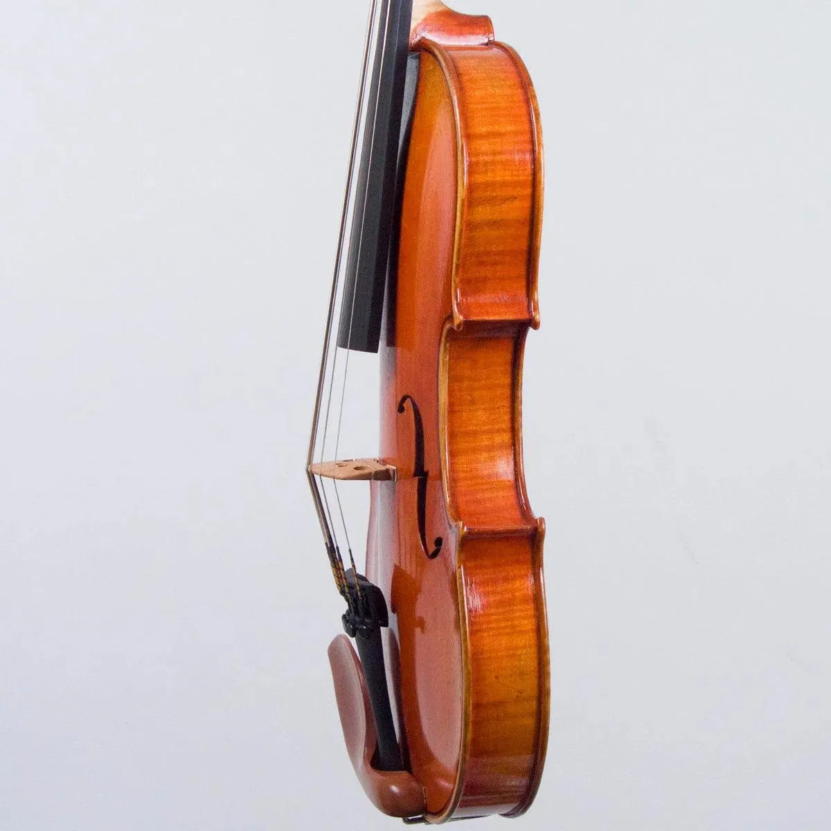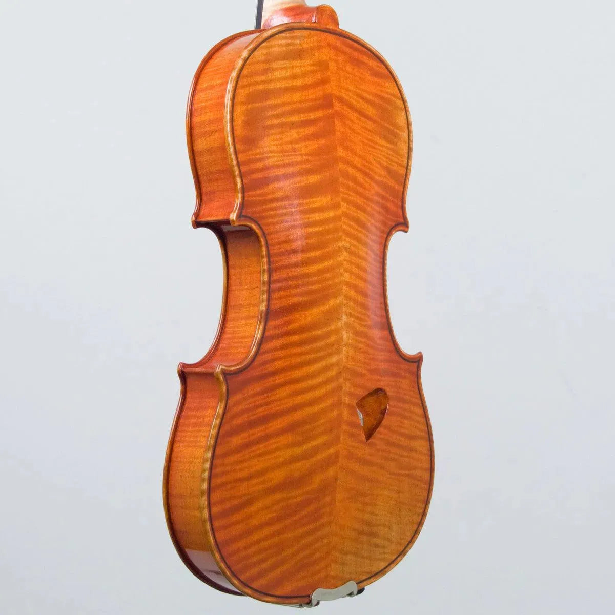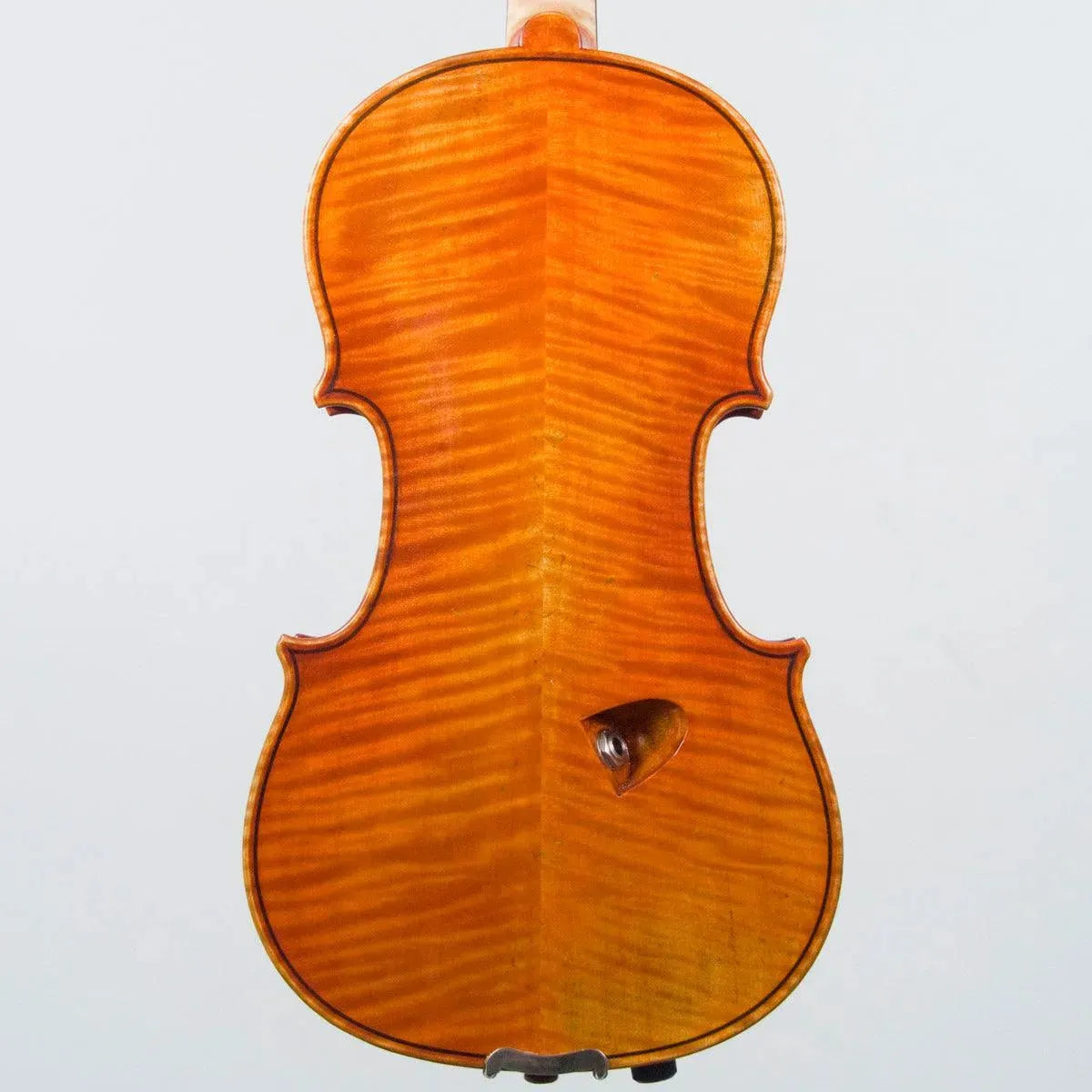 Construction of the Golden Tasman is (for the most part) quite traditional. A top of tightly grained spruce and a highly figured maple back and side are finished in a golden oil varnish. That finish is heavily (but artistically) antiqued. There are two main departures from the look of a classical violin. The first will be familiar to anyone who’s seen a Bridge violin. The shield (inspired by the 1710 Stradivari Viola da Gamba) that has become one of the company’s trademark details sits atop the peg box, instead of a traditional scroll. To mark the electro-acoustic’s dual nature, a lightning bolt inlay on the shield goes in place of the stylized lowercase “b” that marks their line of purely electric instruments.