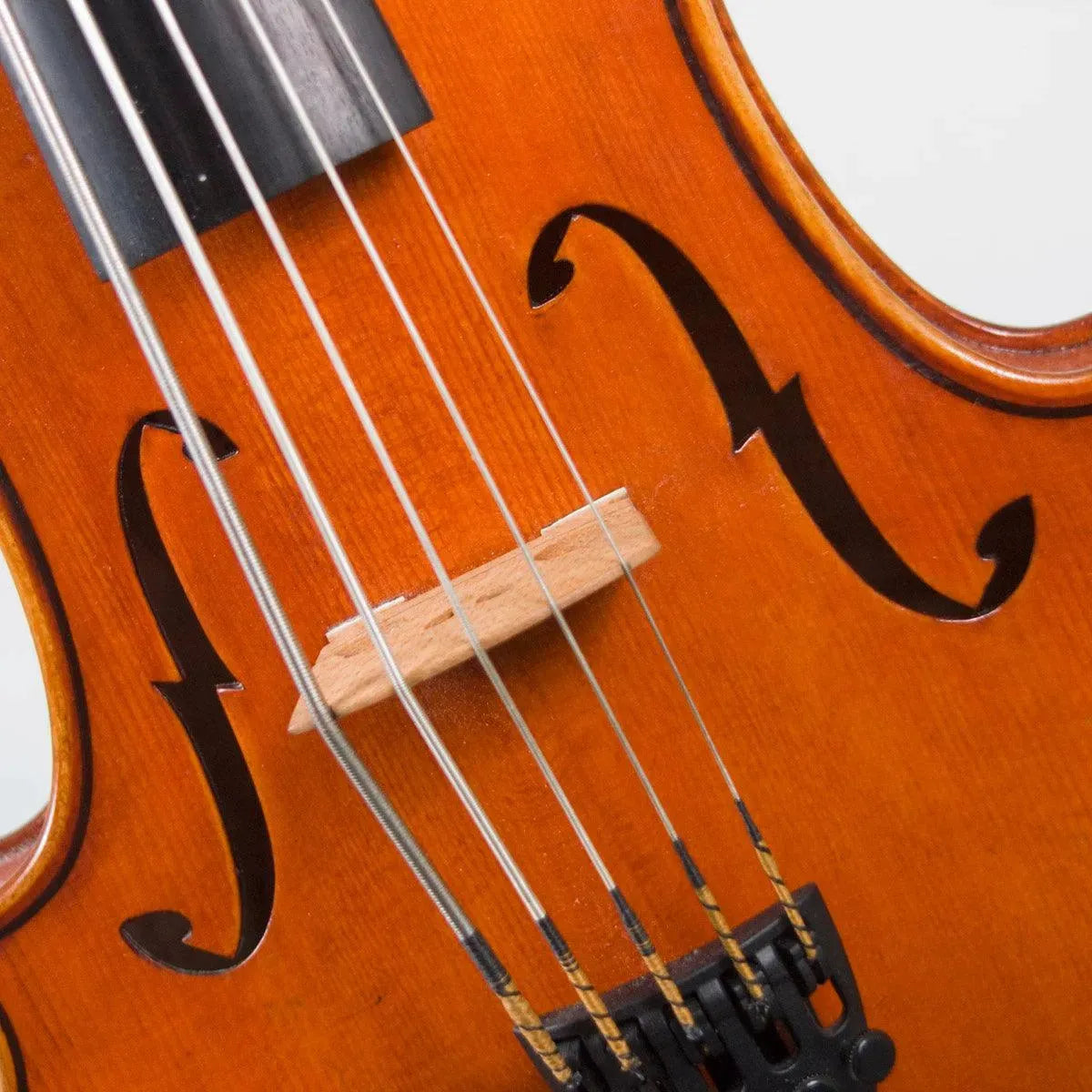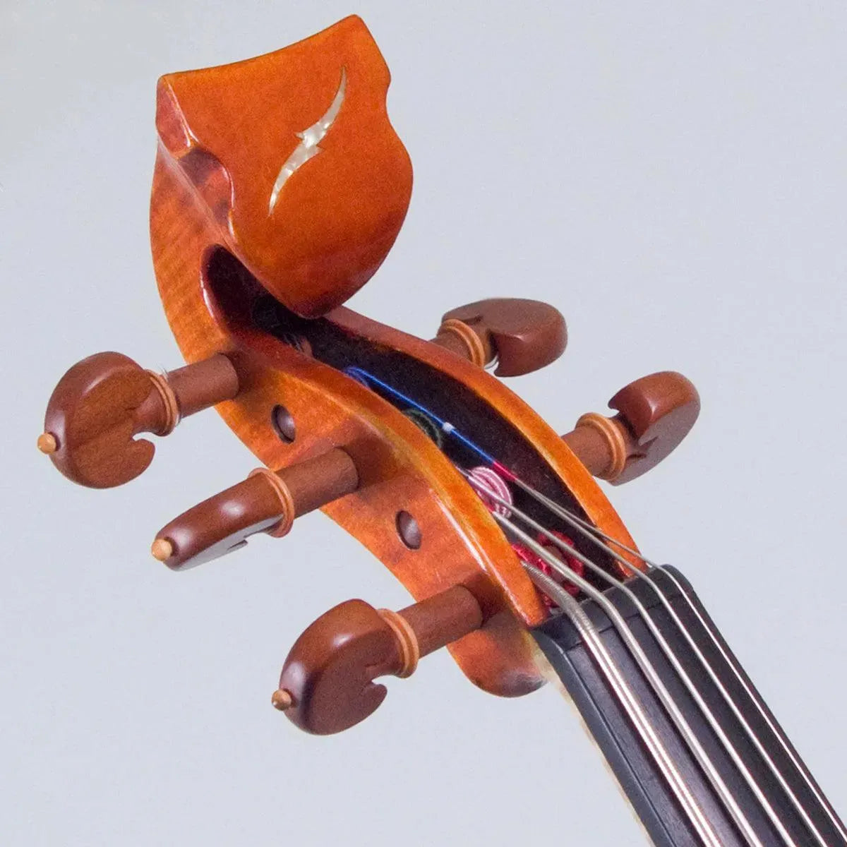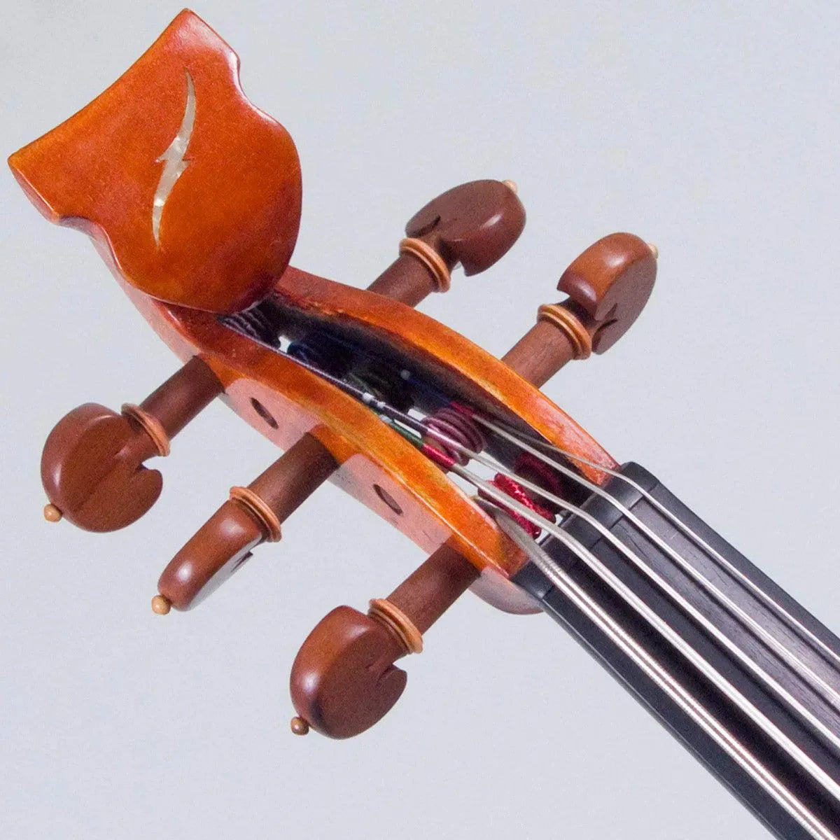 As this instrument is a five-string model, it comes with Sensicore Octave strings, a 14″ scale-length Perlon core set specially engineered to produce the same pitches as a five-string cello. Further modifications include larger diameter peg holes (especially on the bass side), wider string channels at the nut and bridge, and a slightly higher action to allow the much thicker strings to vibrate freely without buzzing against the fingerboard.