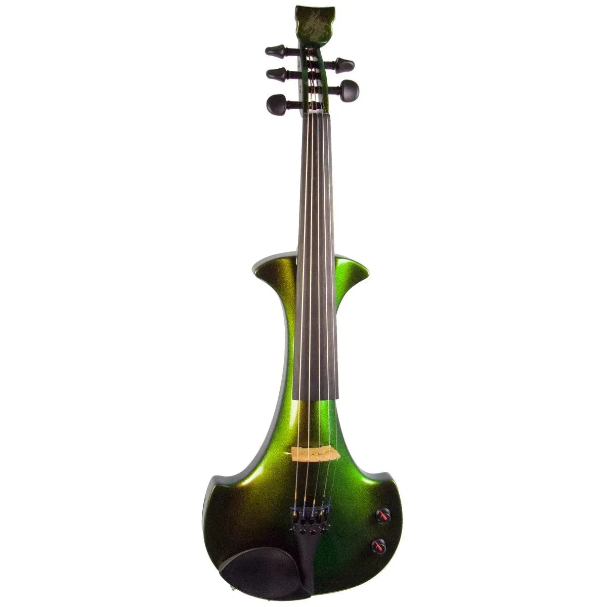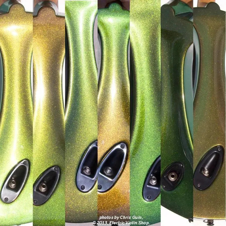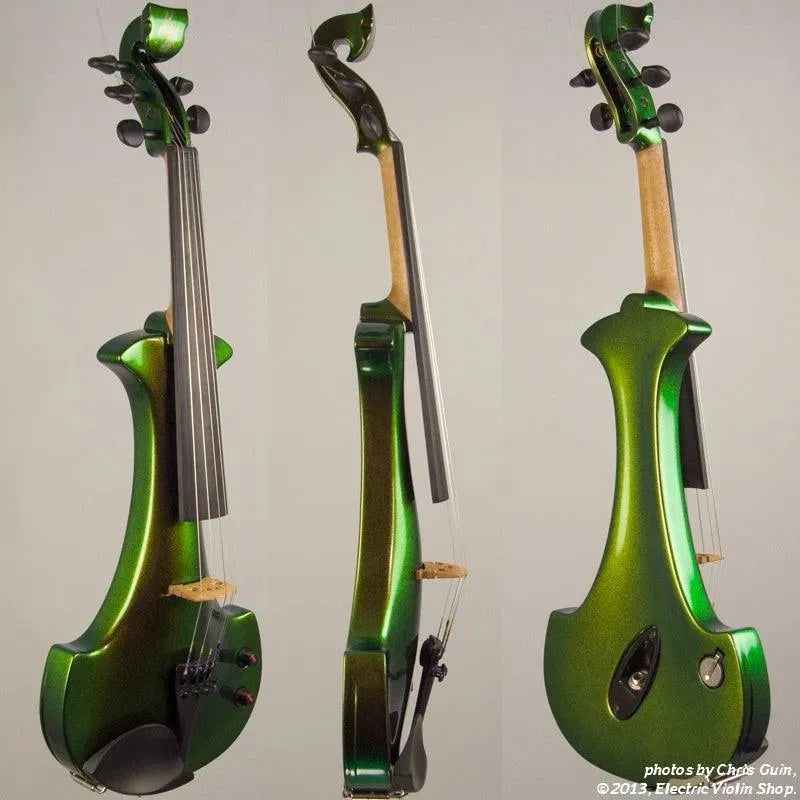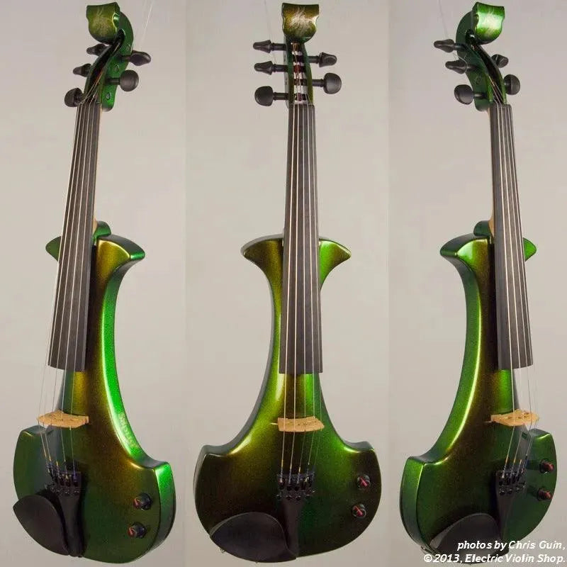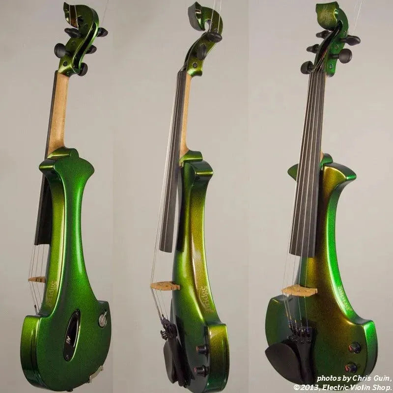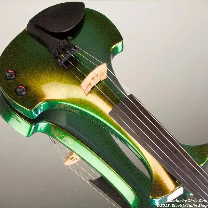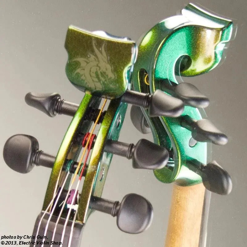 The Bridge Illusion Bronze Lyra Dragon is a custom “hi-spec” model, equipped with Wittner Finetune geared pegs and upgraded electronics that use two coin-cell batteries. We found the instrument’s tone better balanced across the instrument’s range than the standard Lyra, with a noticeably stronger output and more brilliance on the high strings, without treble harshness. The Dragon Lyras are now available in a variety of custom colors. This one is their gorgeous Illusion Bronze finish — look through all the photos — only an actual dragon’s scale might show more color-changing ability.This “hi-spec” custom Illusion Bronze Lyra Dragon from Bridge Violins in the UK sports several upgrades from the standard model, built in the Far East. With upgraded electronics and Wittner Finetune pegs, this is the Lyra for players who are willing to make a bigger investment in an instrument of greater quality. First and foremost, it’s always about tone, and this is where the Lyra Dragon really shines. We already love the sound of the standard Bridge models, yet this Dragon model sounded noticeably better than the standard Bridge 5-string we tested it against. Immediate first impressions were of the instrument’s stronger output, but what really stood out and stayed with us was the beautiful balance of its tone. This Lyra has much more brilliance on the high strings, exhibiting a sparkle and clarity of tone with a notable absence of the harshness that sometimes plagues the violin’s upper register when it’s amplified. Now available in a variety of custom colors, this Dragon Lyra is finished in their beautiful Illusion Bronze paint. Look through all the photos — this finish exhibits color-changing abilities difficult to capture, that only an actual dragon’s scale could hope to match! Tuning is a breeze with the Wittner Finetune pegs, nearly making the fine tuners built into the Wittner composite tailpiece obsolete. The price of the Illusion Bronze Dragon Lyra includes the same custom hard shell case and carbon composite bow that comes with standard Bridge models.
