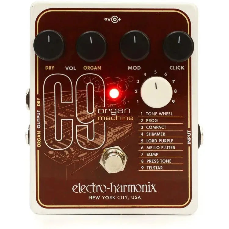 The Electro-Harmonix C9 Organ Machine is not only a fun way for bowed strings players and guitarists to “play the organ” but a convincing substitute for organ parts and fills in bands that lack a keyboard player. The C9 has these nine different classic electric organ tone settings, which consist of various Hammond, Farfisa, Vox, Clavioline and even Mellotron-style tones: