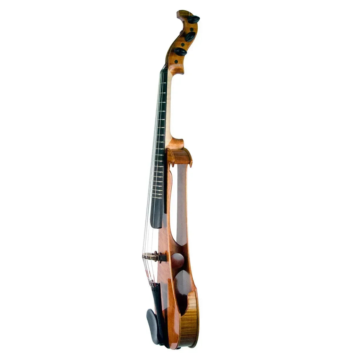 From Fortevio luthier Valentin Hristov in the UK comes the aptly named ‘Feather’ electric violin. The Feather is a lightweight, attractive instrument that’s comfortable to play and has a great amplified tone. Its curvy cutaways leave a central top and bottom with upper bout and lower ribs that have acoustic violin size and specs for ultimate comfort and feel. The transparent finish over its flamed maple body gives it a classic look.