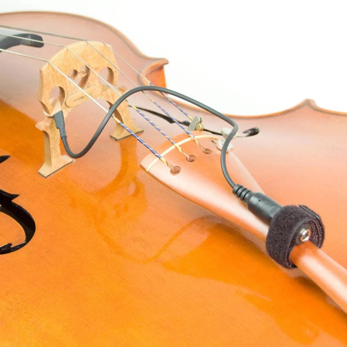 The KNA VC-1 cello pickup is a natural-sounding, relatively low-cost way to electrify an acoustic cello. The transducer element temporarily attaches to the bridge without leaving any marks on the bridge. Output signal is strong enough that no external preamp is needed.