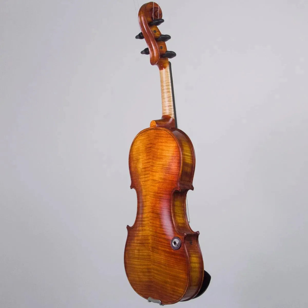 This Realist Violin Pro has the ‘Frantique’ finish, which is a warm, reddish gold over the close-grained spruce top and tightly-flamed maple of the back and sides. So as not to distract from the attractive look of the violin, the pickup is almost invisibly embedded into the top plate, just beneath the bridge, the tone controls are wooden knobs that are discreetly tucked into the treble-side C bout, and the the 1/4 output jack is well hidden but conveniently placed on the backside of the instrument.