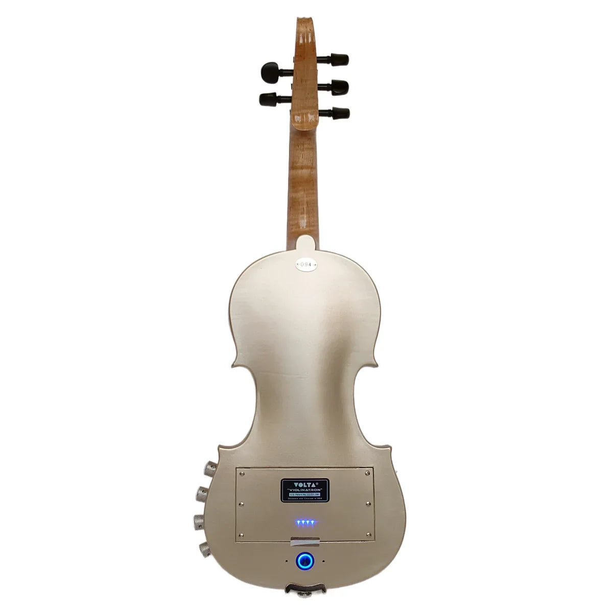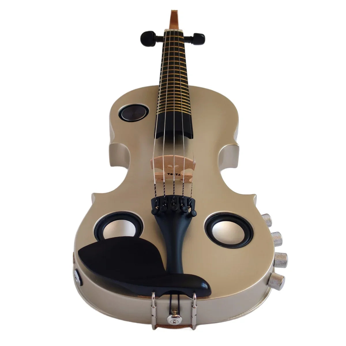 A new kind of hybrid violin, the Volta Violinatron offers both unplugged and amplified performance, but is not acoustic-electric…at least not in the traditional sense. What it is is a chambered body electric violin with built-in powered speakers and built-in reverb. The speakers’ output is loud enough for solo performance in a reasonably quiet setting, for self monitoring in a band environment, or simply for a great sounding practice experience. When you need to really crank it, simply plug Violinatron into an amplifier as you would any other electric violin and rock out!